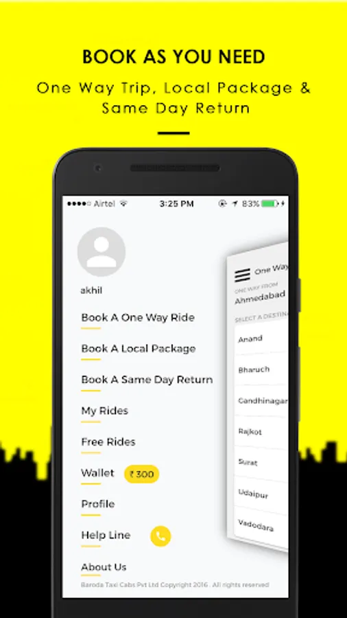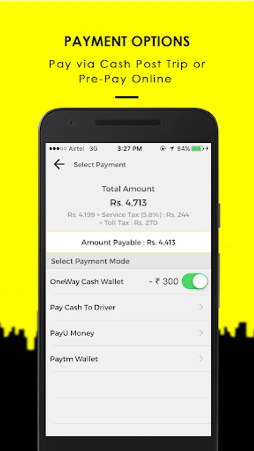 Book your taxi in easy steps using OneWayCab app: 1. Select your Pick-up city, Destination city, Car type