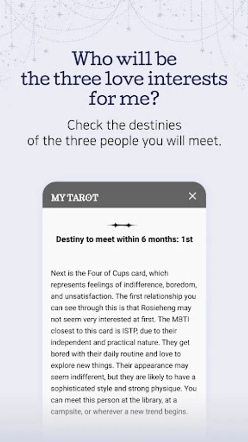 MyTarotAI, your dedicated tarot reader, is always ready to aid your queries, anytime, anywhere. Download now and let MyTarotAI resolve your concerns and curiosities. Start a fresh tarot consultation experience today!