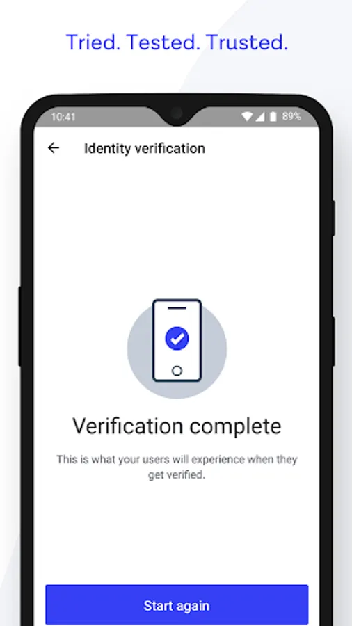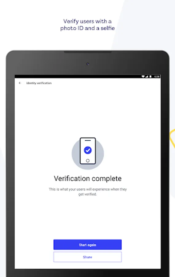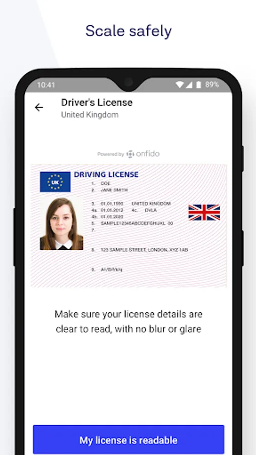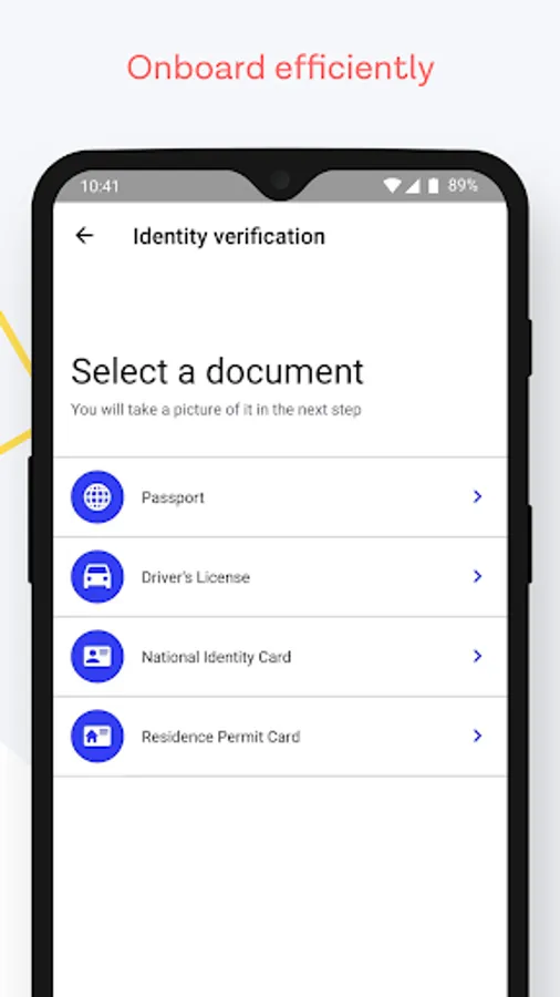 Experience the onboarding journey offered by Onfido. You’ll be asked to take a photo of your ID document, and a short selfie video.