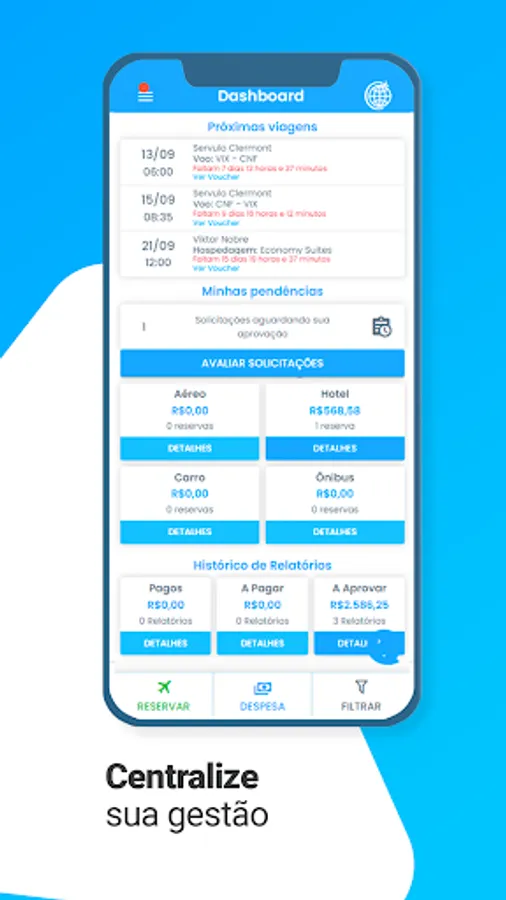 Gain competitive pricing and inventory coverage with our multibroker solution. At Onfly, travel policies, approval flows, budgets, reports, locks and conditional blocks ensure efficiency in spending management. In addition, you can book your airline ticket, hotel, car rental or bus transfer in our platform in just a few clicks.