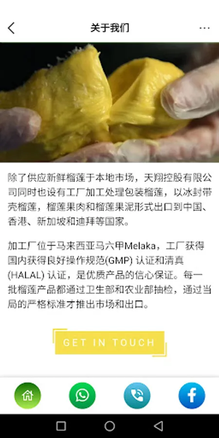 加工厂位于马来西亚马六甲Melaka,工厂获得国内获得良好操作规范(GMP) 认证和清真 (HALAL) 认证,是优质产品的信心保证。每一批榴莲产品都通过卫生部和农业部抽检,通过当局的严格标准才推出市场和出口。