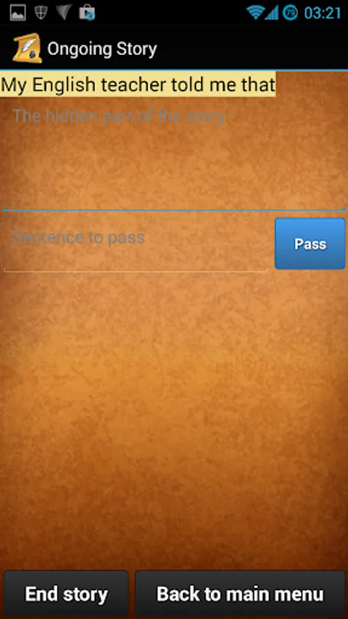 The players see each time only the last words of the text written by the previous player, so that they can continue it with the right context. When the last player chooses to end the story, the full story will be discovered. The story parts are colored with different colors.