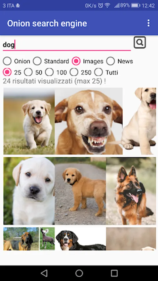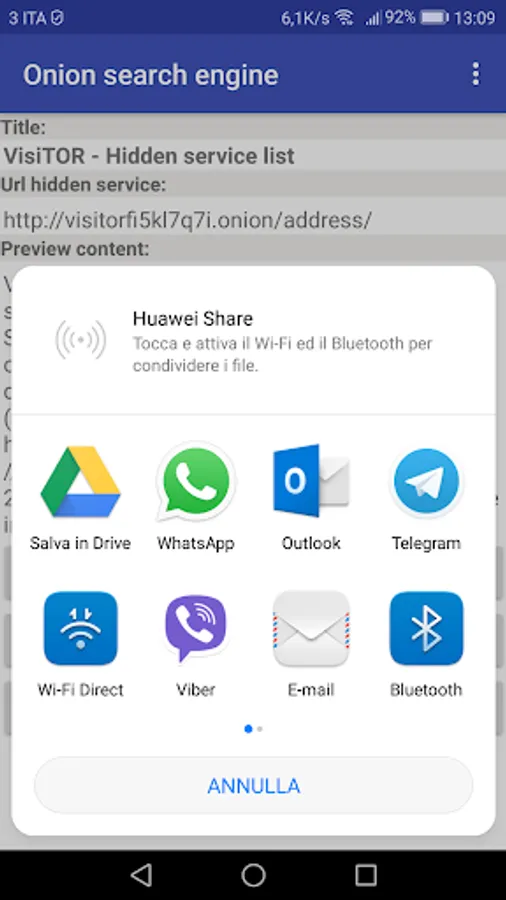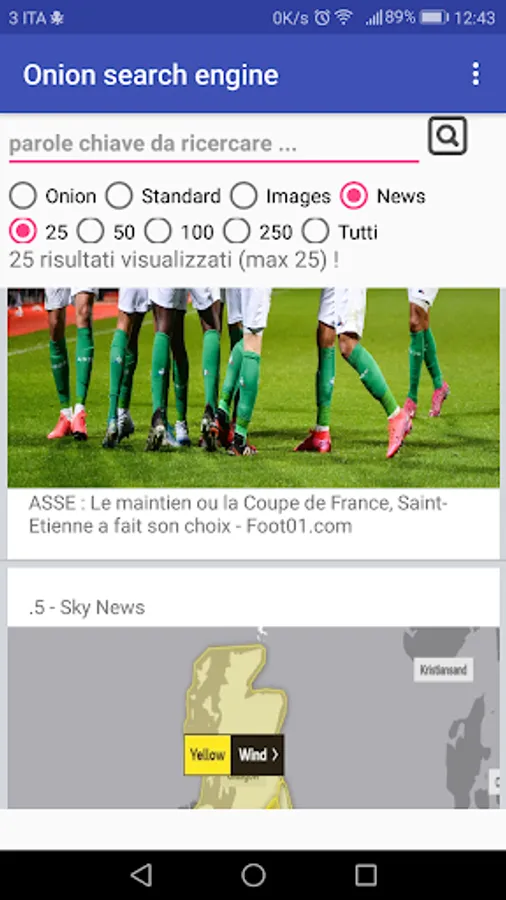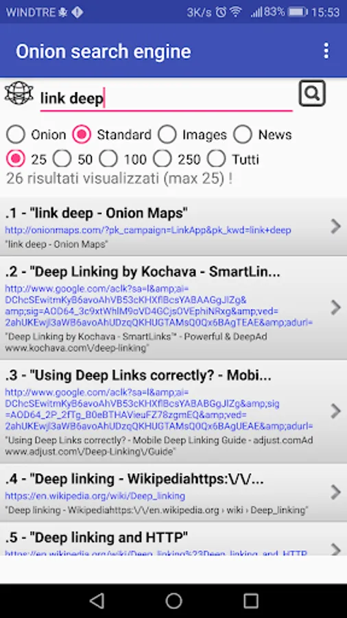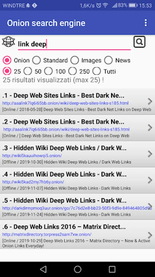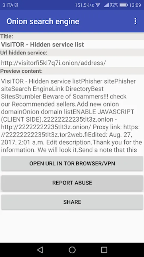 The app lets you search the sites in the deep web with the keywords and shows you a site tab with title, url and an preview of the content.