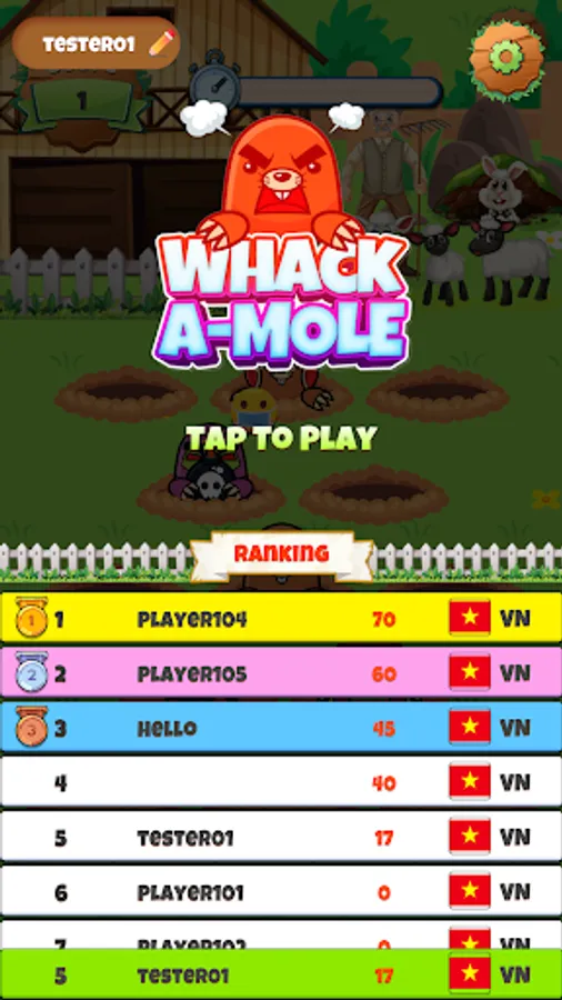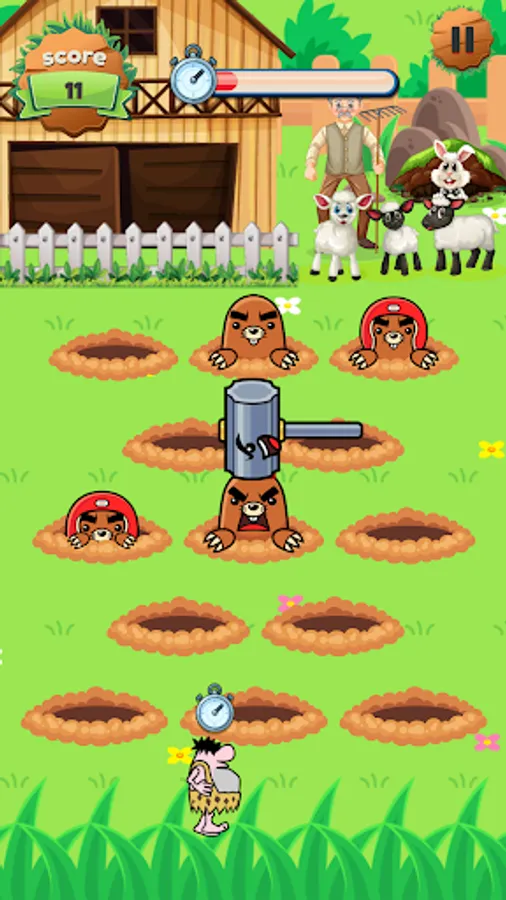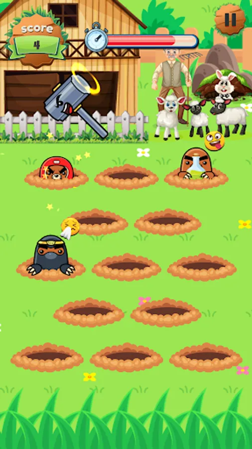 #Each hole contains a single plastic mole and the machinery necessary to move it up and down. Once the game starts, the moles will begin to pop up from their holes at random. The object of the game is to force the individual moles back into their holes by hitting them directly on the head with the mallet, thereby adding to the player's score. The more quickly this is done the higher the final score will be.