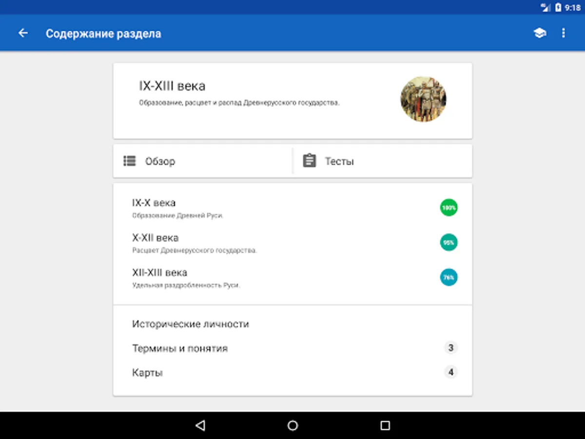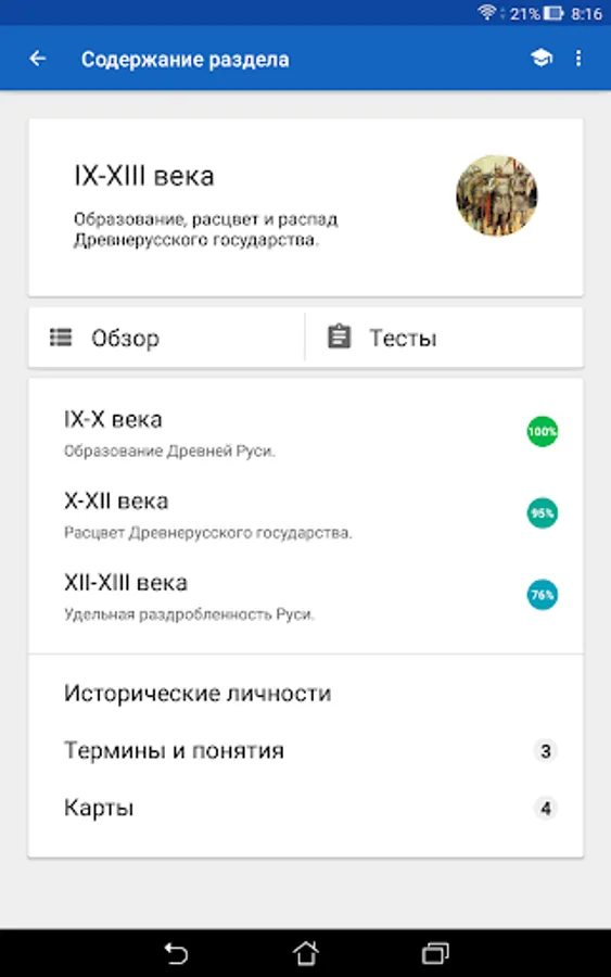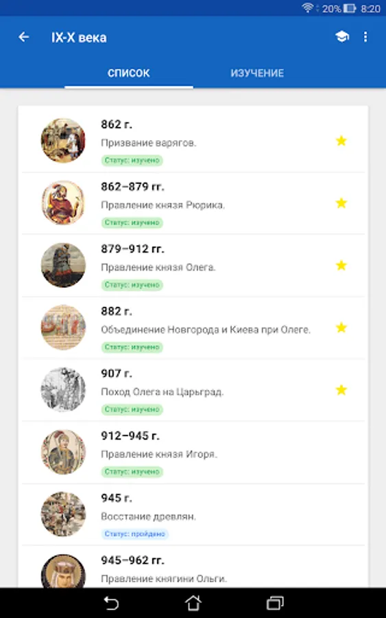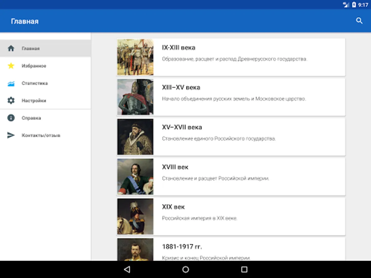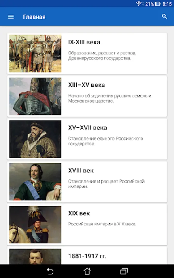 The History of Russia application is intended to help everyone interested in studying Russian history. The application does not aim to replace the teacher, tutor or history textbook, but provides information about historical events and personalities in a convenient format, and also offers additional tools for studying and consolidating knowledge, including cards, tests with performance assessment, statistics on the progress of studying, Search for information in the application. The application can help prepare for tests, tests, exams, and also come in handy in preparing for the exam or exam in history.