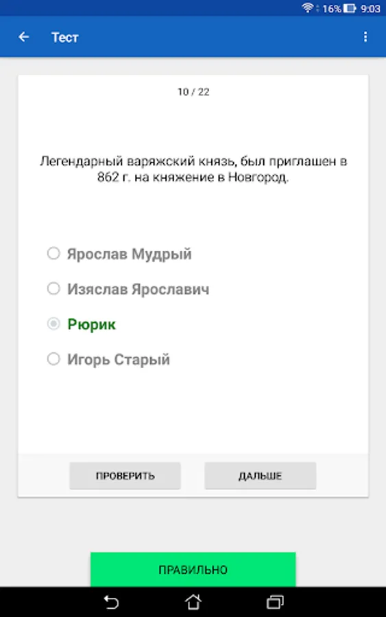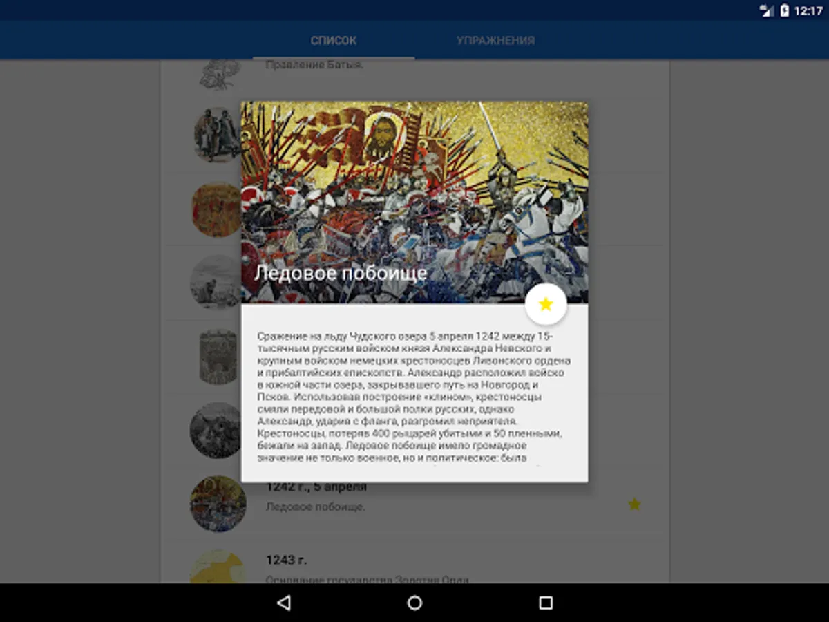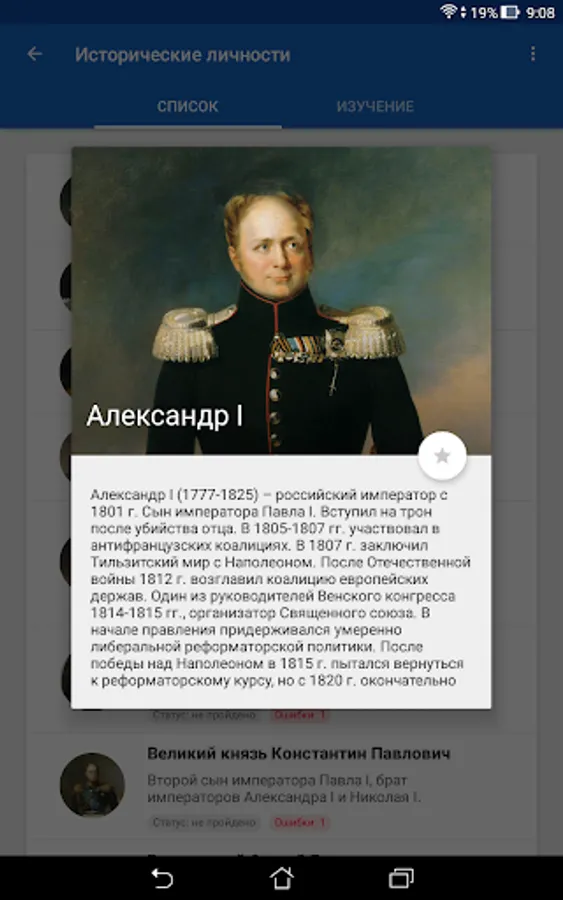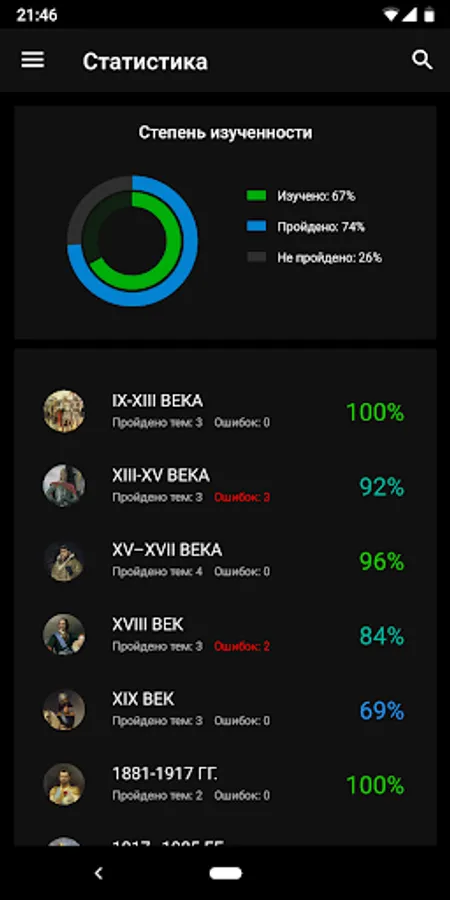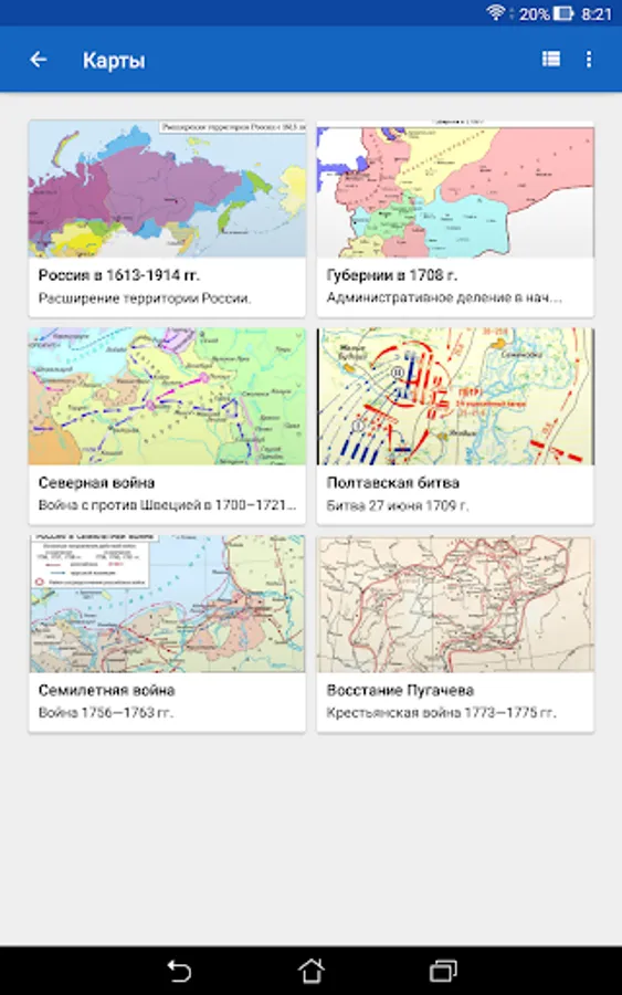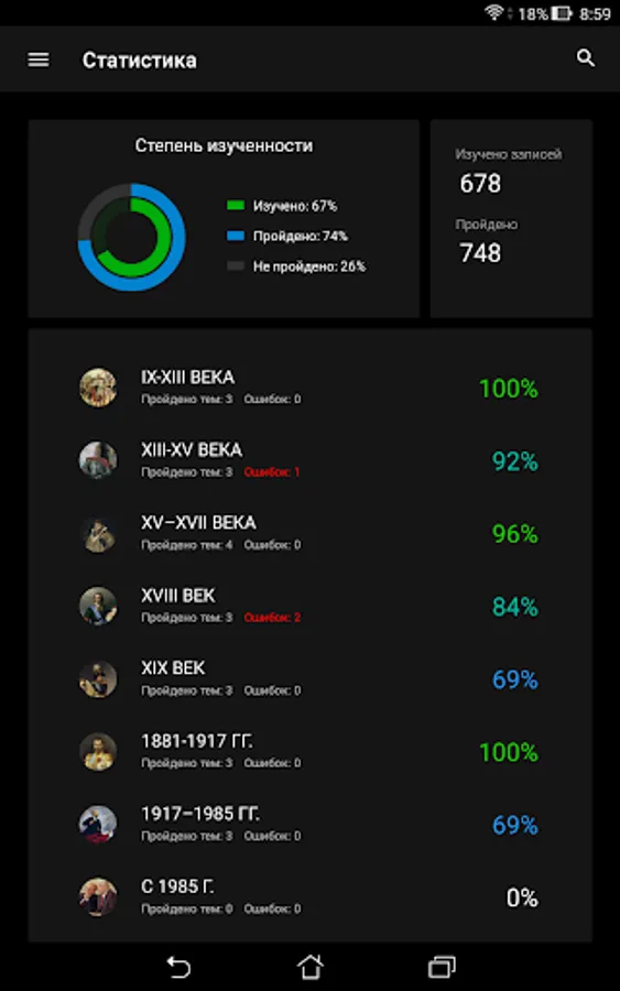 The History of Russia application is intended to help everyone interested in studying Russian history. The application does not aim to replace the teacher, tutor or history textbook, but provides information about historical events and personalities in a convenient format, and also offers additional tools for studying and consolidating knowledge, including cards, tests with performance assessment, statistics on the progress of studying, Search for information in the application. The application can help prepare for tests, tests, exams, and also come in handy in preparing for the exam or exam in history.