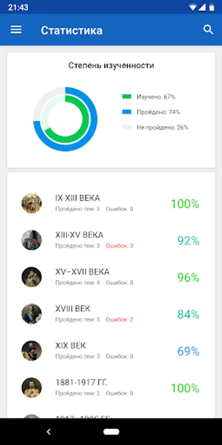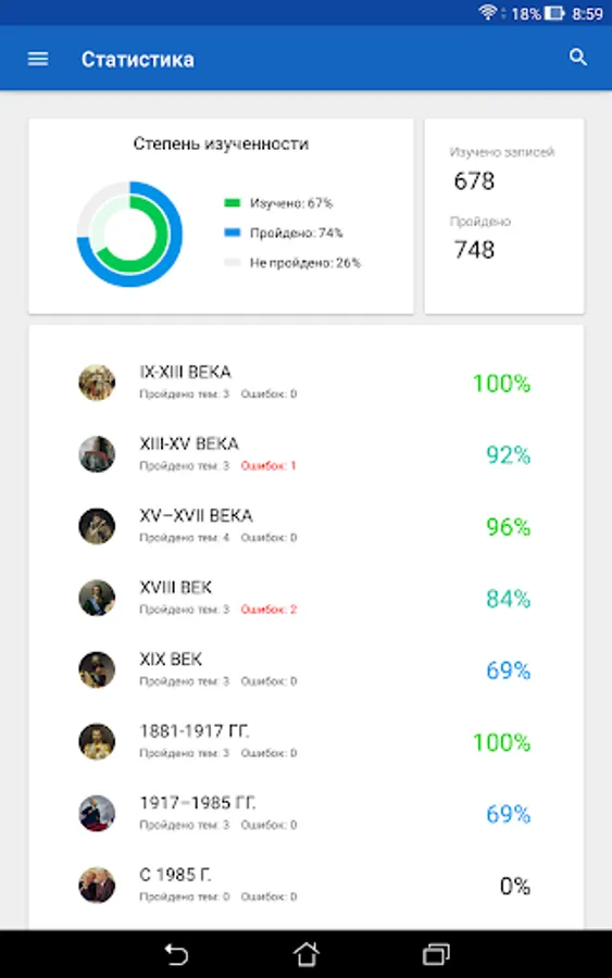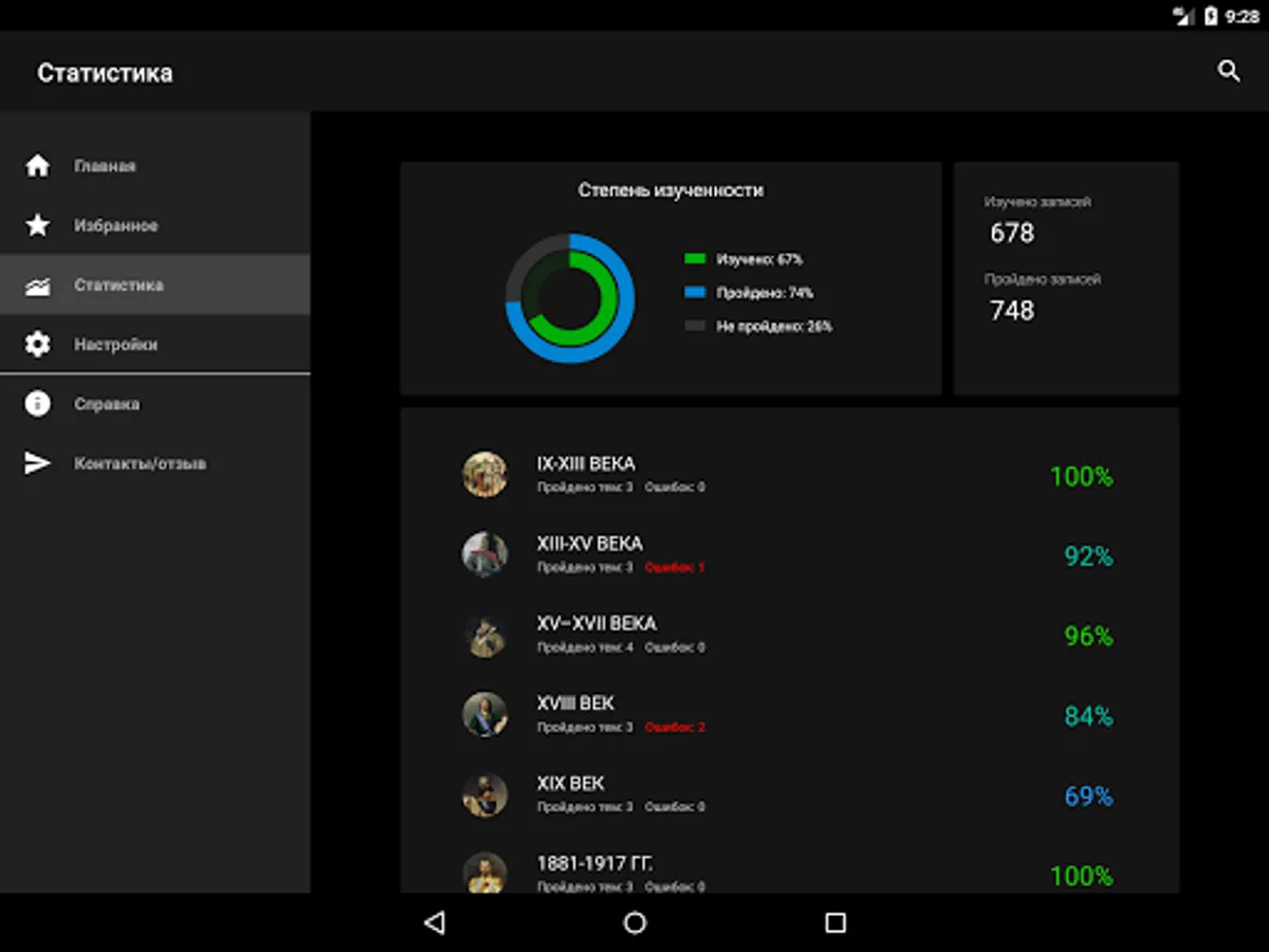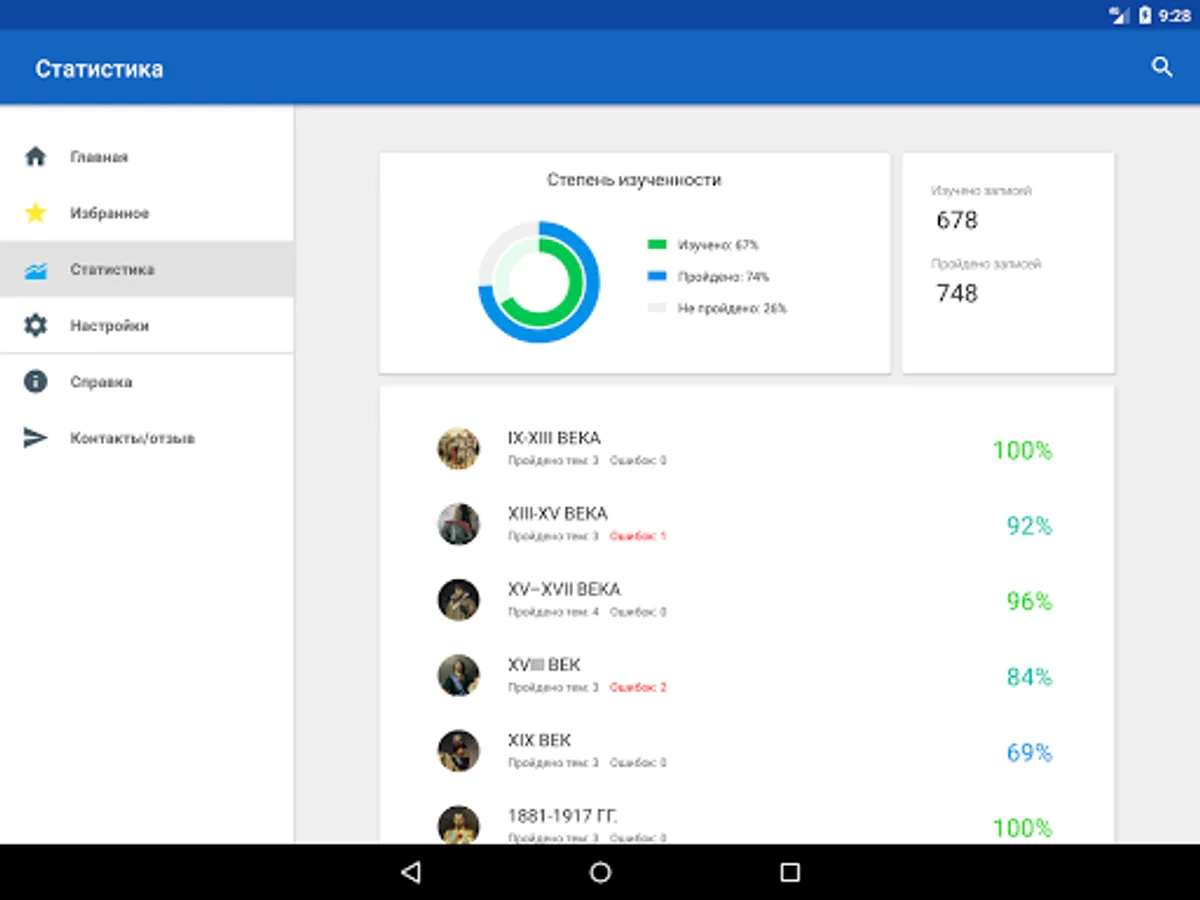 The training material in the appendix is divided into sections that provide information on certain periods of the history of Russia, such as Ancient Russia, the Moscow Empire, the Russian Empire, the USSR, the period of the Russian Federation. In each section there are several topics, including lists of the main events of Russian history, terms, personalities, as well as exercises for studying and consolidating the information presented. For additional work with educational material, individual notes can be added to favorites. The test results are saved in the application, which makes it possible to assess the level of knowledge of the material, as well as to see and correct the mistakes made.