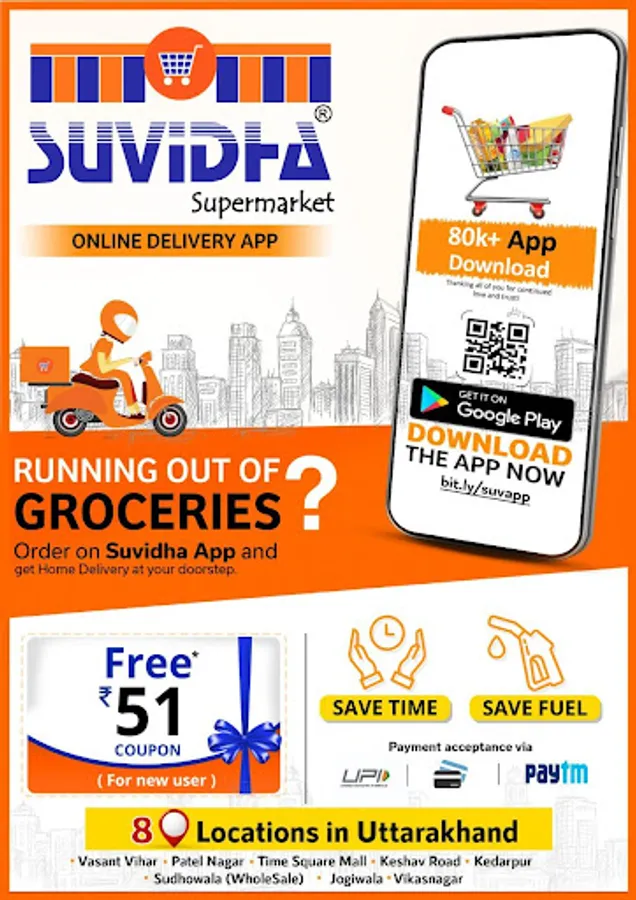 Suvidha Supermarket Grocery Store is the best online delivery platform in Dehradun with up to 2 Lakh app downloads. Suvidha Supermarket has been serving its customers since 1971 with the aim of providing “Behtareen Quality and Kam Daam”.