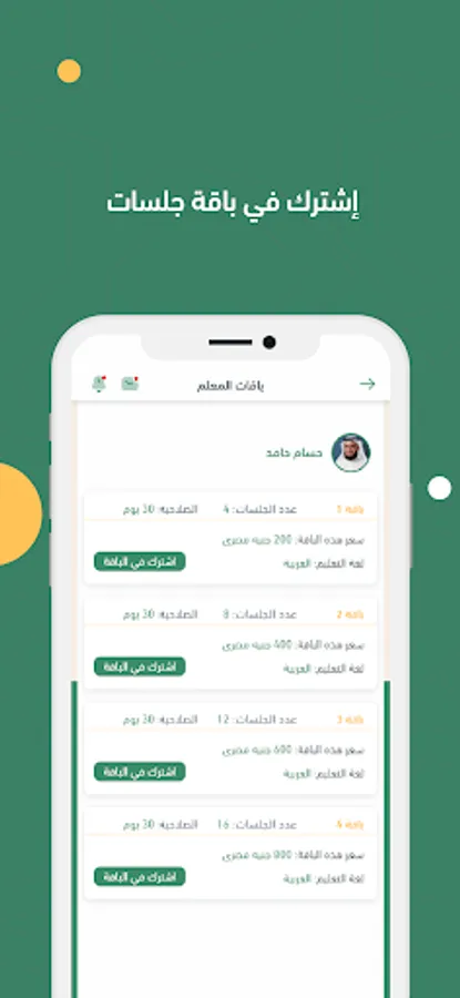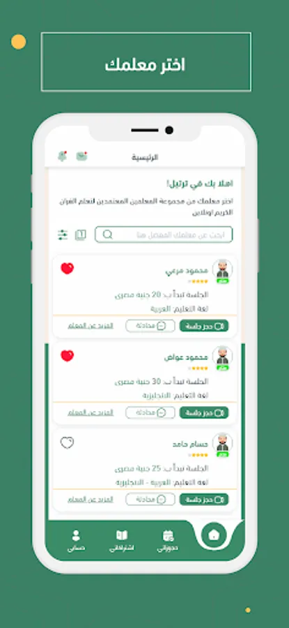 كل معلم يكون له ملف شخصي يعرض من خلاله خبراته و مؤهلاته العلمية .. مواعيد عمل متاحة لكي يستطيع الطلاب الحجز فيها .. سعر الجلسة الخاص به، كلما كان الملف دقيق كلما زادت فرص المعلم للحصول علي مزيد من الطلاب المشتركين.