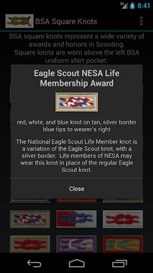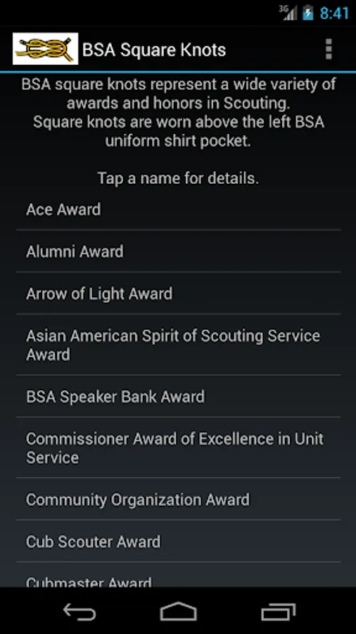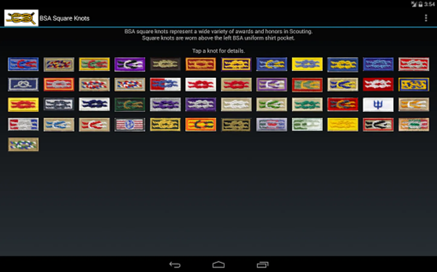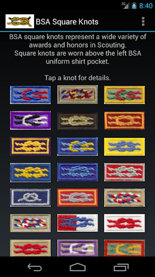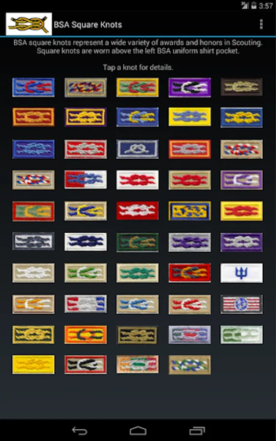 The purpose of BSA Square Knots is to quickly identify the square knot patches that appear on Boy Scouts of America uniforms, especially while mobile. The requirements for each knot can be found online.