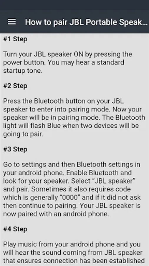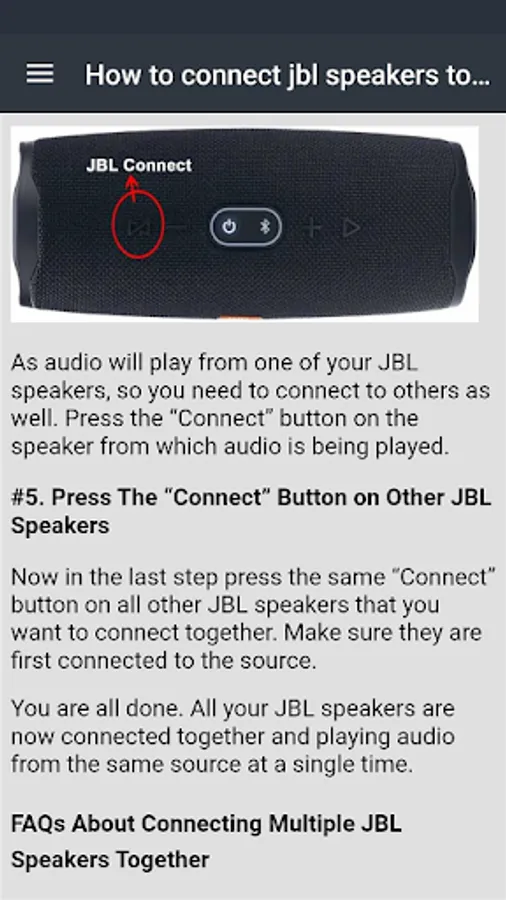 You can learn what you want to know about jbl portable speaker from our mobile app. You can find topics such as how to setup and pair jbl speakers, how your device connects to television, laptop and iphone, and how to connect multiple speakers such as flip, clip, pulse, extreme and boombox with jbl connect feature.