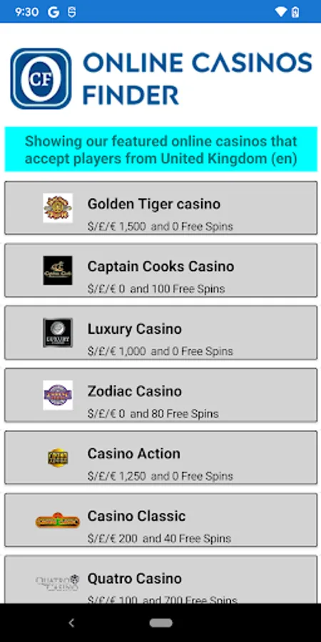 The OCF - Online Casinos Finder app brings you honest reviews of a hand-picked selection of the top online casinos right in the palm of your hand. We have scoured the web to bring you some of the finest online gambling establishments you can find. The casinos offer gambling in a variety of casino games like real money slots (slot machines), blackjack, and roulette. When you download the app, you get a customized selection of casinos that accept players from your country. You would therefore need to give us permission to determine your location to use the app.