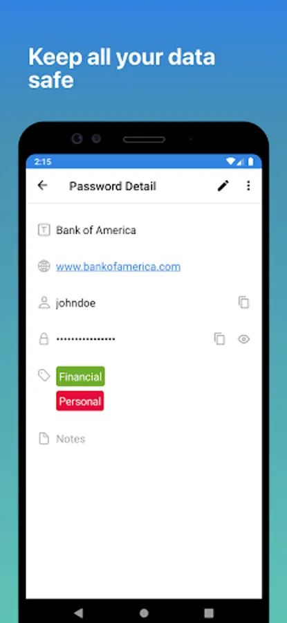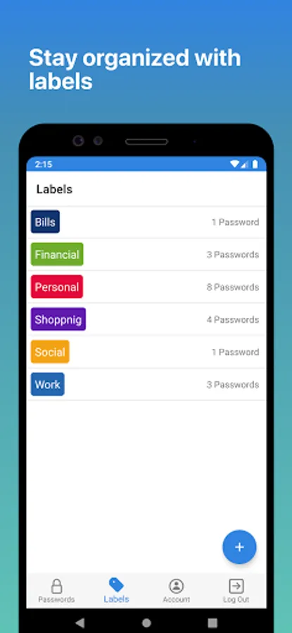 In the passwords view you can see your passwords and search for specific ones using a password's title, url, username, password or notes. You can also filter passwords by label to view only passwords related to a specific part of your life such as work or shopping.