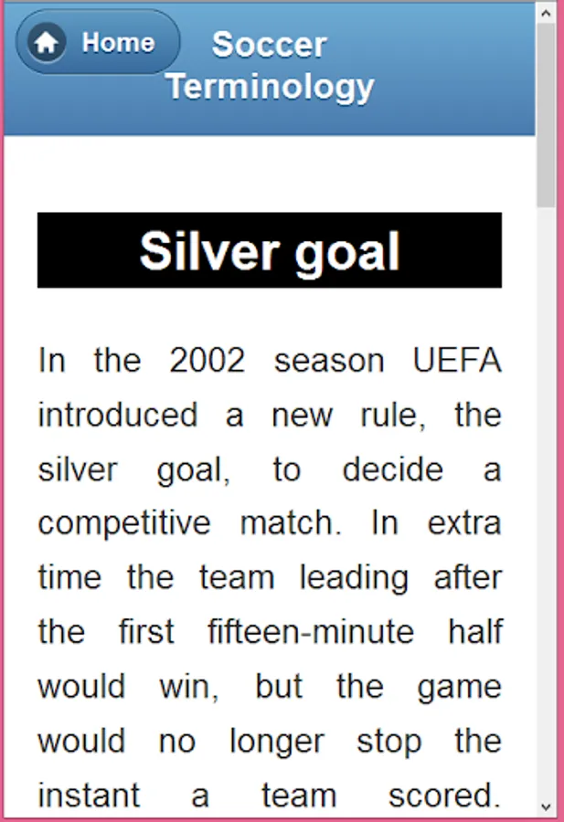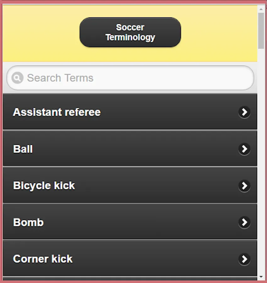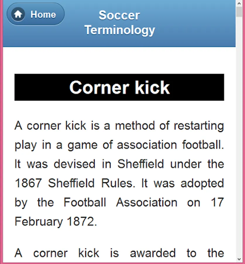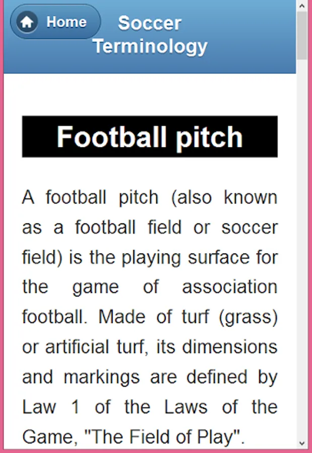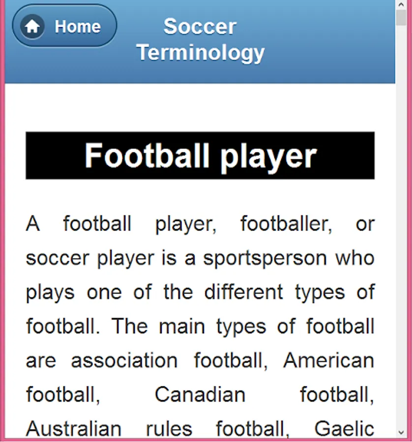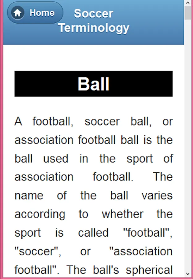 Soccer, also called Football in South Asian countries is the most popular game in this earth. There are many Terms and terminologies in this game. Some are known and some are not commonly known to the spectators. The spectator who knows the terms and terminologies of the game enjoys much better than the spectator who doesn’t know. In this app we tried to illustrate the idea of this game in easy language. We hope this app will help the users to know about the Game Soccer.