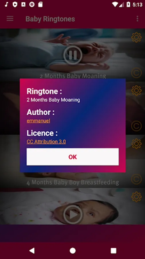 Sound clips used in Baby Sounds & Ringtones sound app are under public domain license and/or Creative Commons’ license. Sounds from this app are not commercial sounds from video games. App design and code copyright "Baby Sounds and Ringtone" Apps.