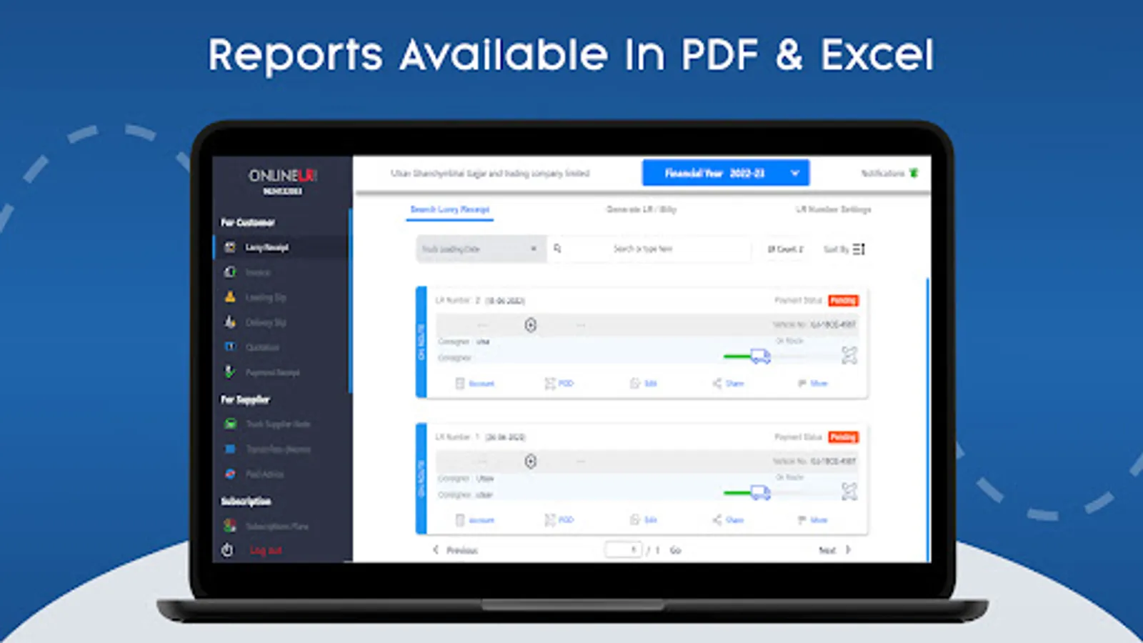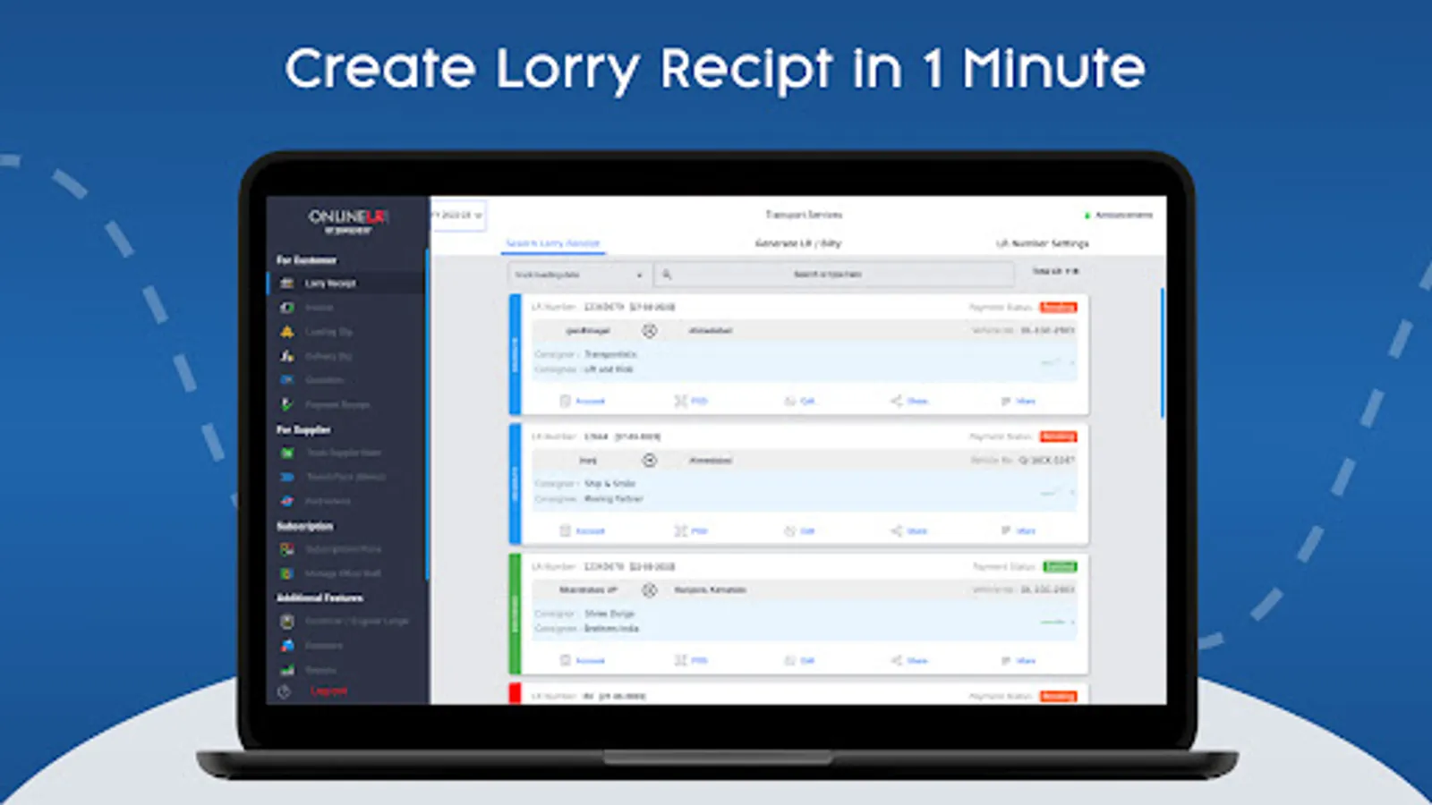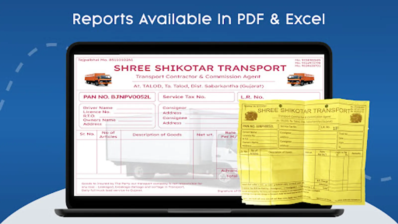 Create any transport document’s pdf formate with just 2 steps - Lorry Receipt,Invoice, Truck Advice ,Quotation,Loading Slip, Cash Voucher etc