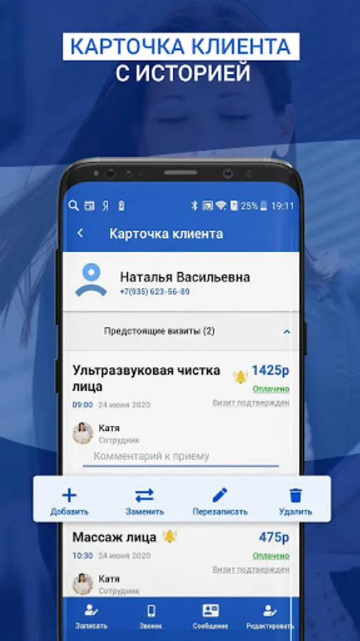 ✅ All customer history in one place: name, phone number, birthday, as well as visits, procedures, payments. The client's card allows you to form his portrait as accurately as possible so that you can offer him the best service.