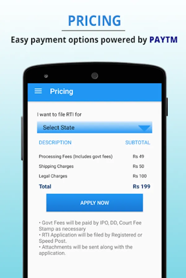 OnlineRTI.com is an online service to file your RTI application. We have a unified interface to file RTI application to all center and state departments. With this app you can file RTI application directly from your Android devices.