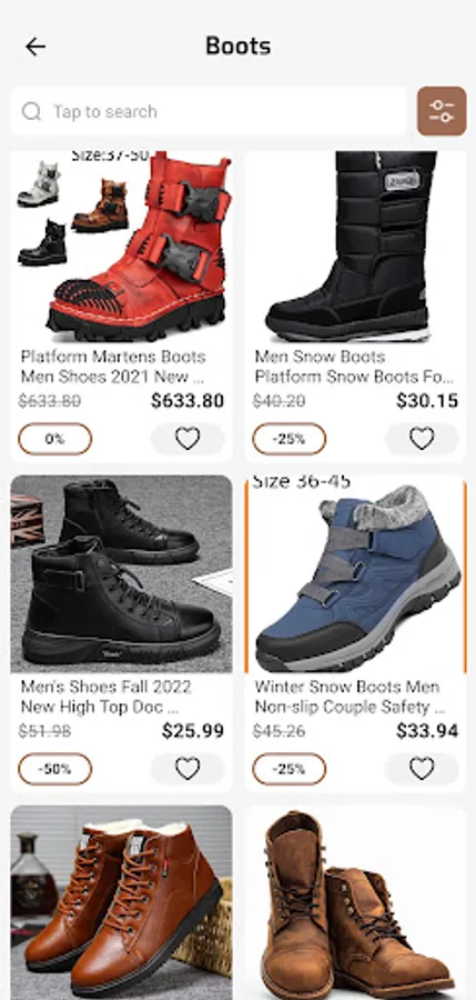 Whether you’re looking for boots like snow boots, work boots and platform boots, or other shoes like hiking shoes, skating shoes and wedding shoes you can find in our shopping app all these shoes for men and many more