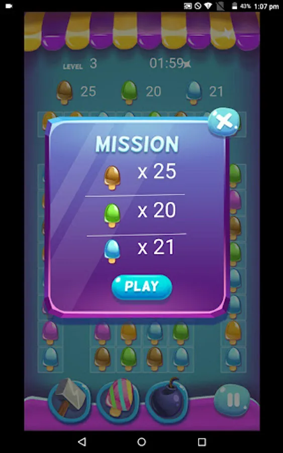 Complete missions are given at the start of each level. Use Rainbow lolly booster, Bomb blast booster, or hammer lolly booster to enhance your score.
