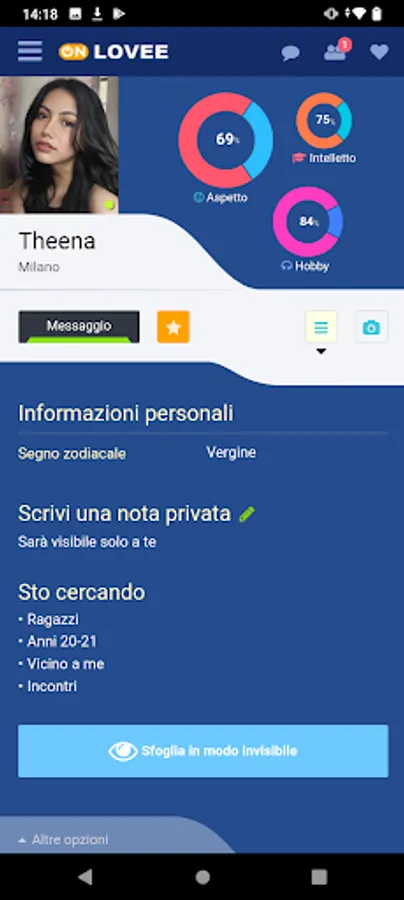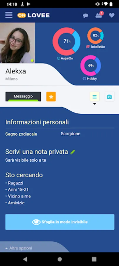 Onlovee dating, friendships and chat is the a completely free app site for women (who verify the profile with mime photos) in Italy: among the thousands of profiles and photos, in onlovee you will find many interesting singles in chat and in video chat find the true love with onlovee, thousands of users have already registered, what are you waiting for? Register for free and find your soul mate now.