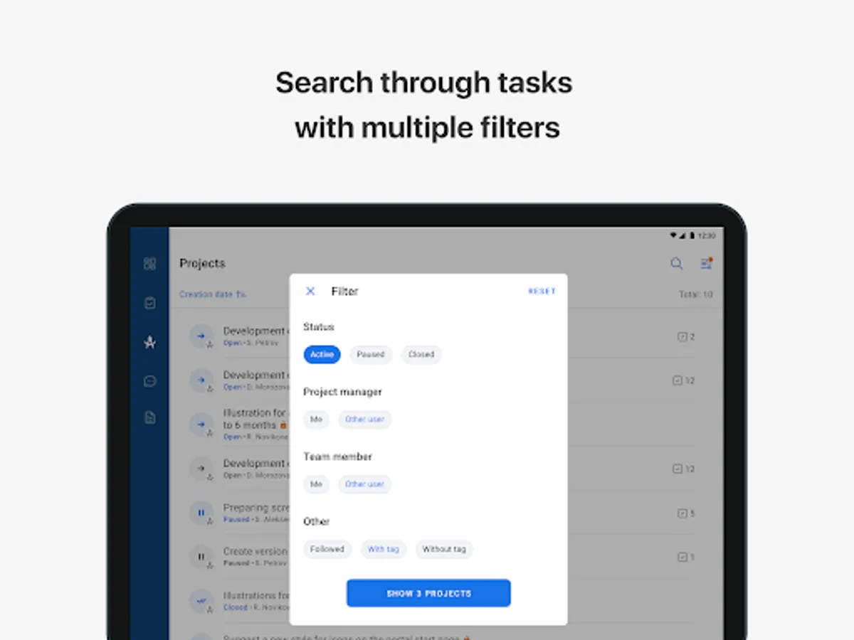 Find any task in seconds. Filter your search by creators and responsible users, projects, milestones, and dates. Sort tasks by deadline, priority, creation date, start date, or order.