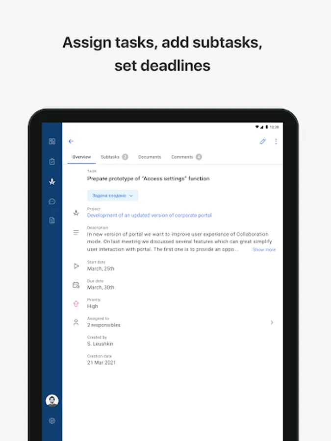 ONLYOFFICE Projects app is your team’s smart project planner. The task management system allows creating tasks and assigning the responsible members. Set task priorities, start and due dates, change task status. Add smaller subtasks to each task to give individual assignments. Add tasks to milestones to plan your work in time.