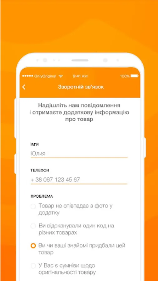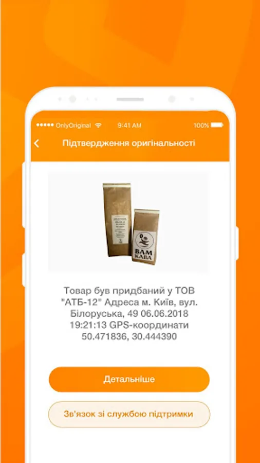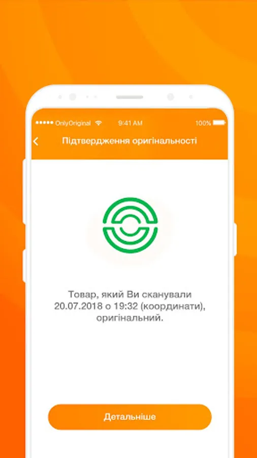Besides, using app OnlyOriginal, you will help us to fight against counterfeit sales, control supplies and sales of original goods. At the moment when you are scanning the product code, the producer will be informed that his / her product with a concrete SKU and unique identifier was interesting for customer in a specific geographic location. This product code can be valid, elsewise if application user holding a counterfeit product, than our system will inform user about it, and at the same time it will inform producer that his/her product was sold 2 month ago.. that this good should be in another city.. and simply, there is no such product code in the system ...
