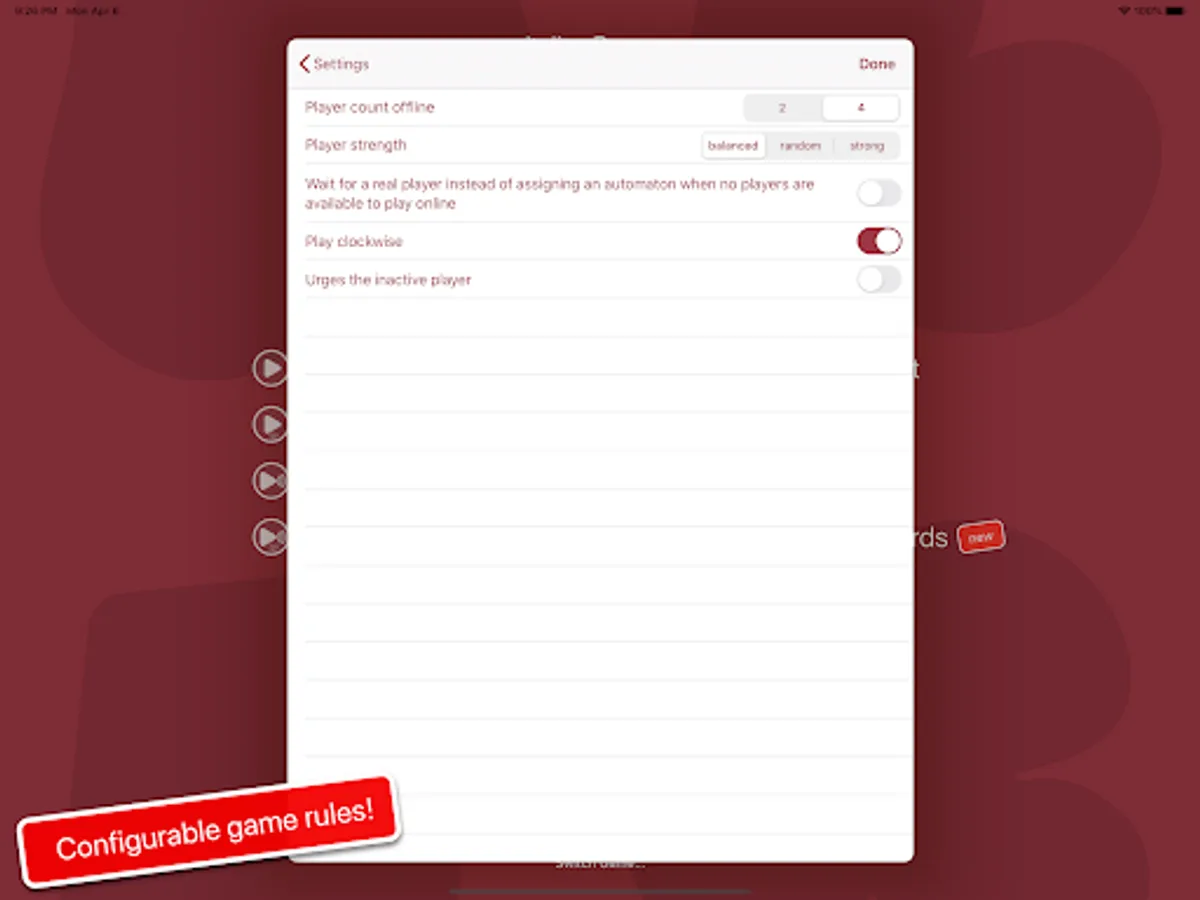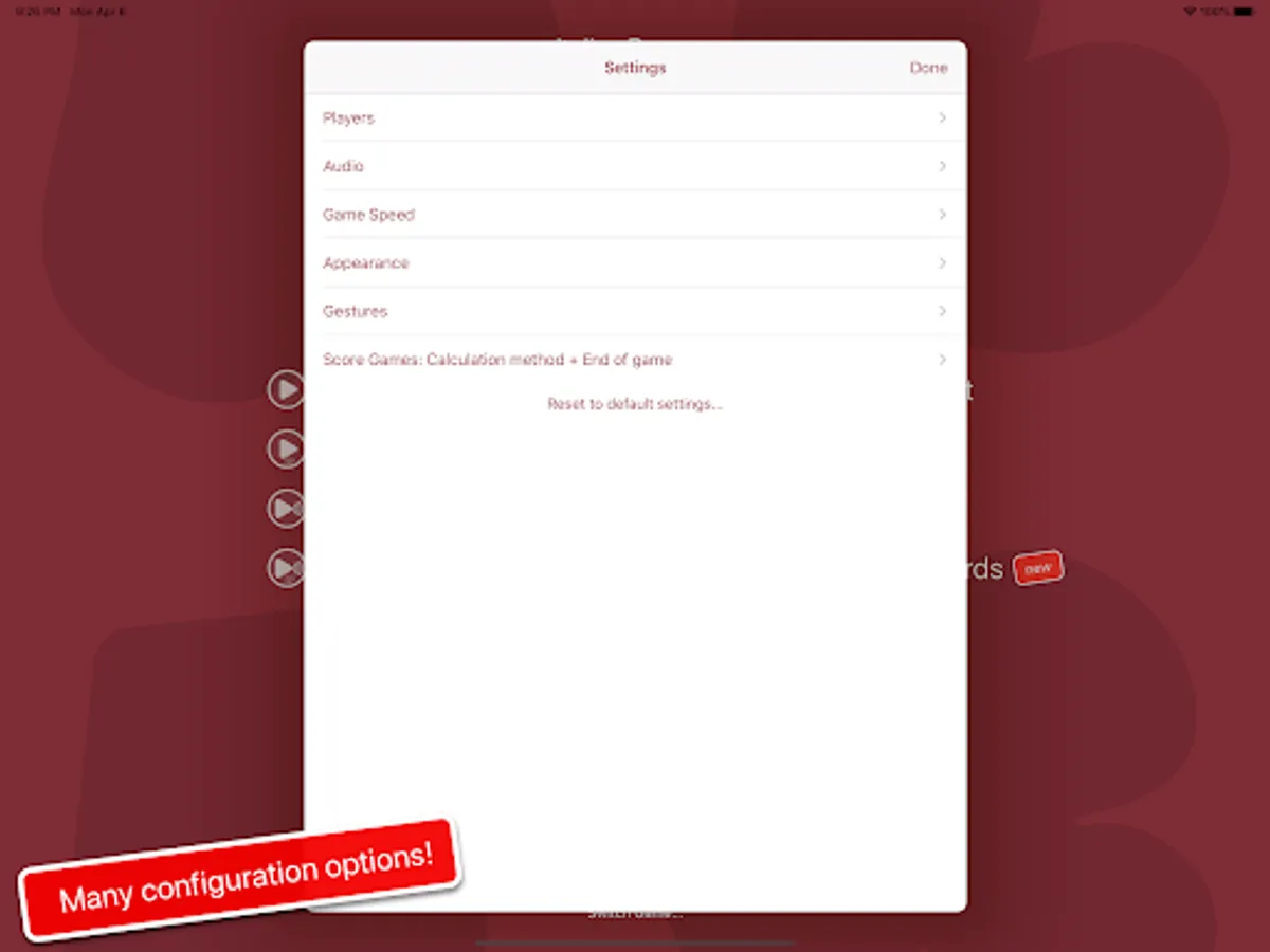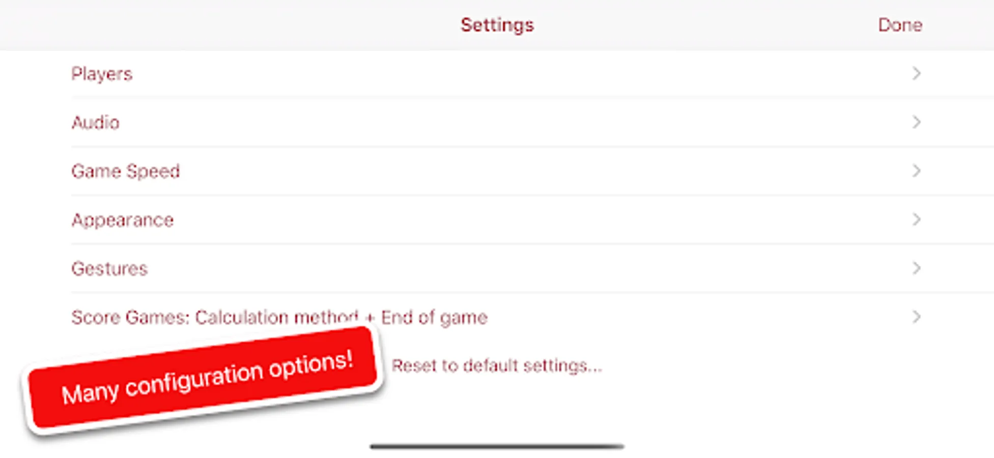 - many game configuration settings (Players, Strategy, Audio, Game Speed, Appearance, Gestures)