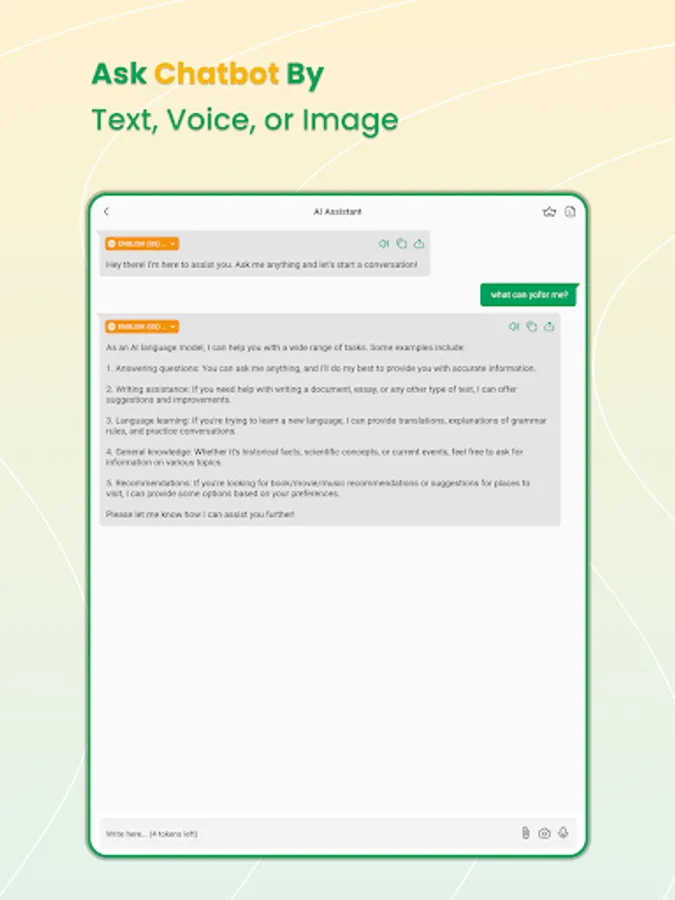 Language Translation: Translate text or speech into any language, making communication with people from other countries easier. Example: "Translate 'hello' into Spanish."