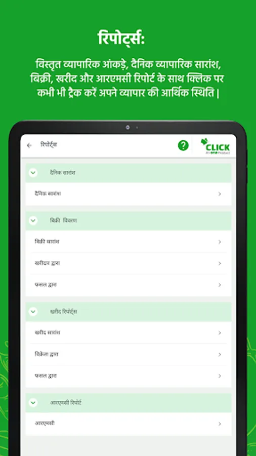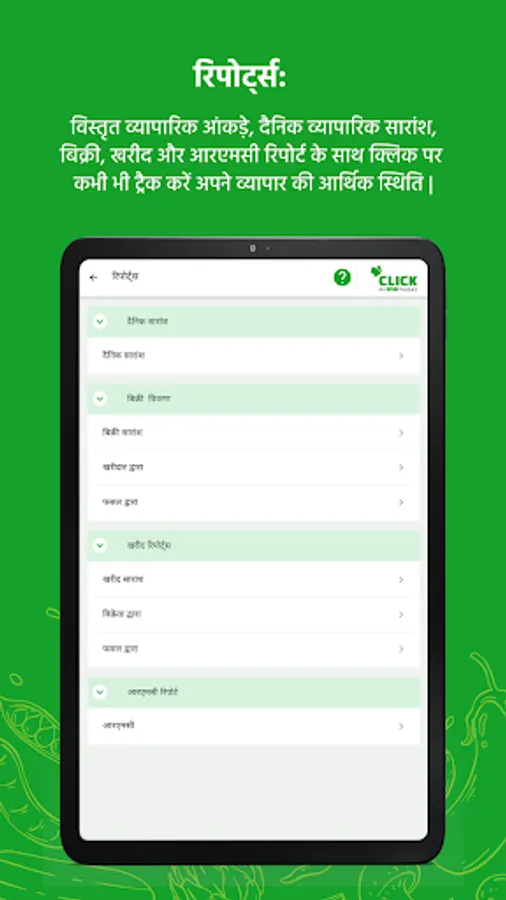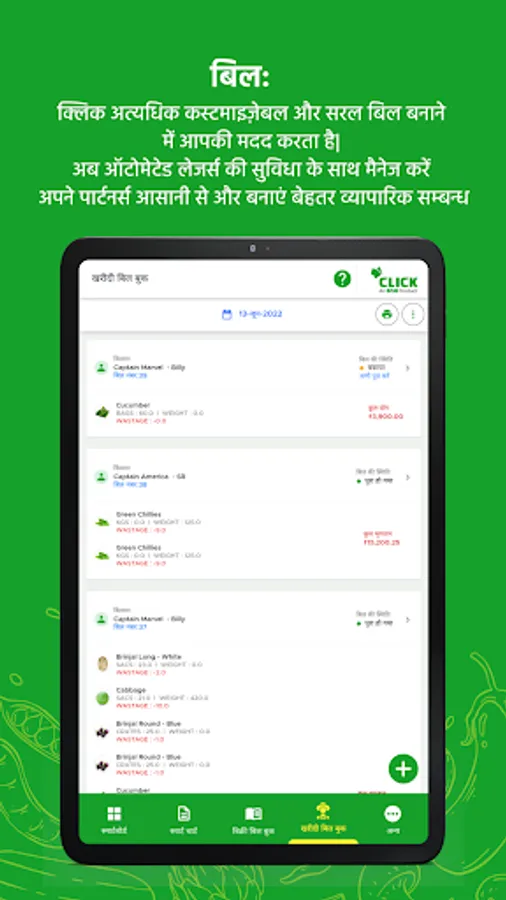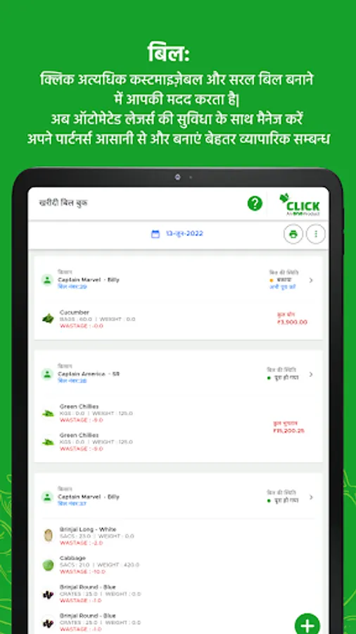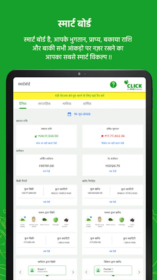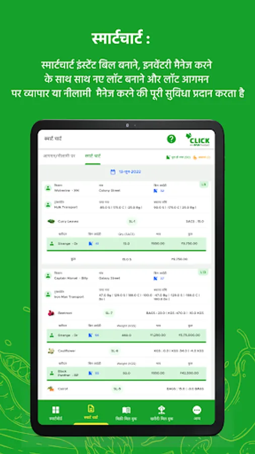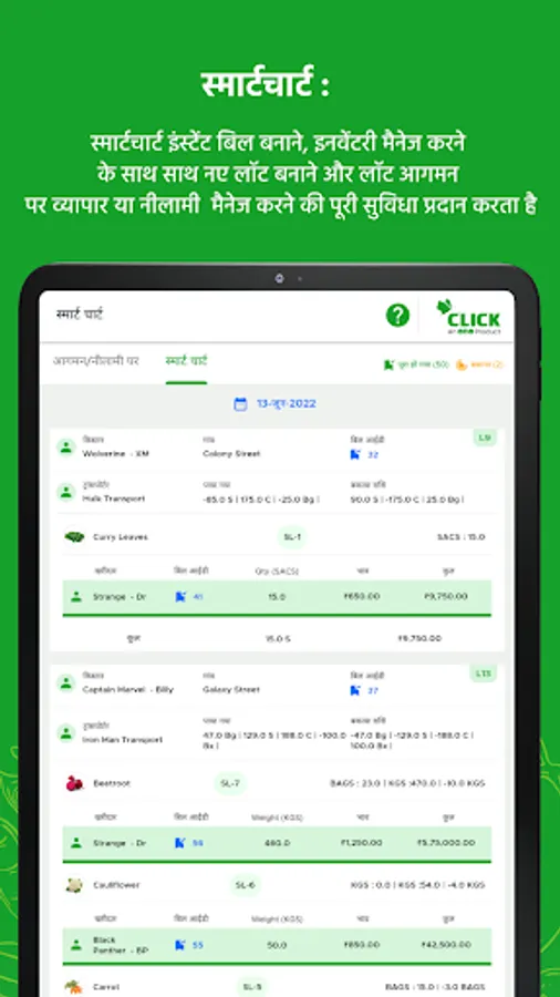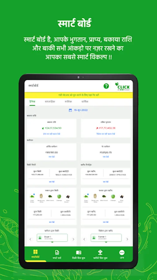 CLICK is the most preferred mandi app for commission agents across India. From automated bill generation to automated ledgers and real-time notifications. Smartboard and Smartchart provides better insights of the business at fingertip, detailed reports, partner management and global bill settings enable flexibility to operate with ease. CLICK is the one stop solution to digitize your mandi operations, gain market insights, make better decisions and increase your profits. CLICK helps you manage your mandi operations efficiently, anytime and anywhere.