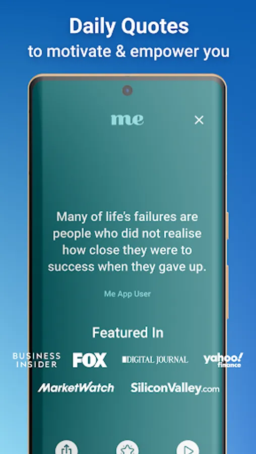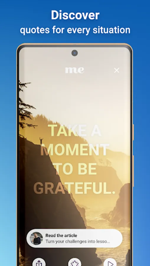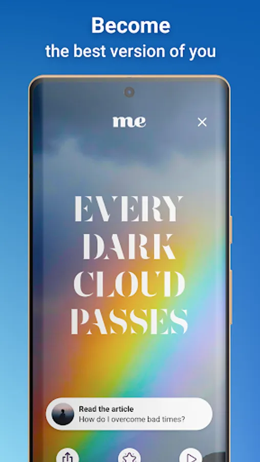ME means motivation for everyday! It is a unique motivation app that offers many elements to help you build a positive mindset and inspire confidence. In addition to giving you a daily dose of new affirmation of the day or daily quotes to be yourself, we have a large library of curated content for daily motivations, mental & physical health.