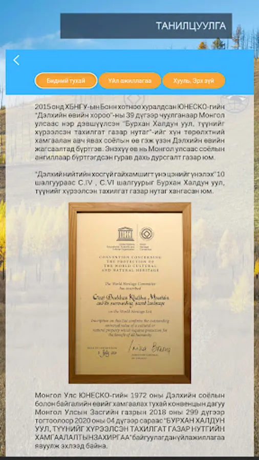 It is aimed at raising awareness and raising awareness of the “World Heritage-God Khaldun Mountain and the surrounding sacred land”. Using VR AR technology solutions, it will provide interesting information in the online environment, provide citizens with cognitive and scientific information, build pride in the Motherland, Mother History and Nature, and support the preservation and registration of monuments.