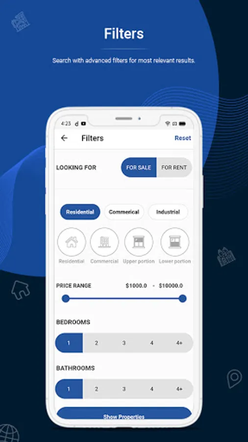 On the screen user can view properties with all the detail and agent information and can add own property for buy, sell and rent.