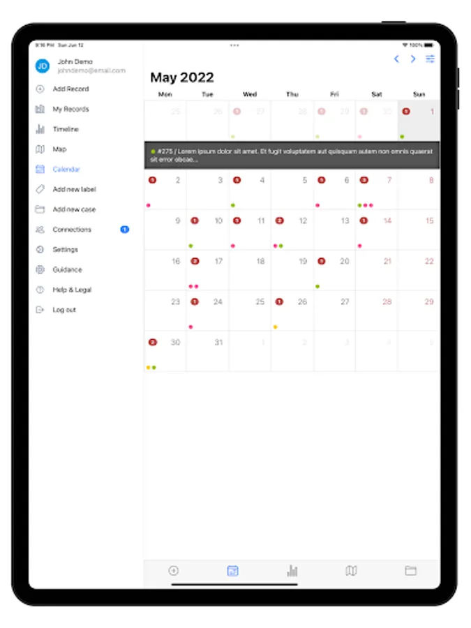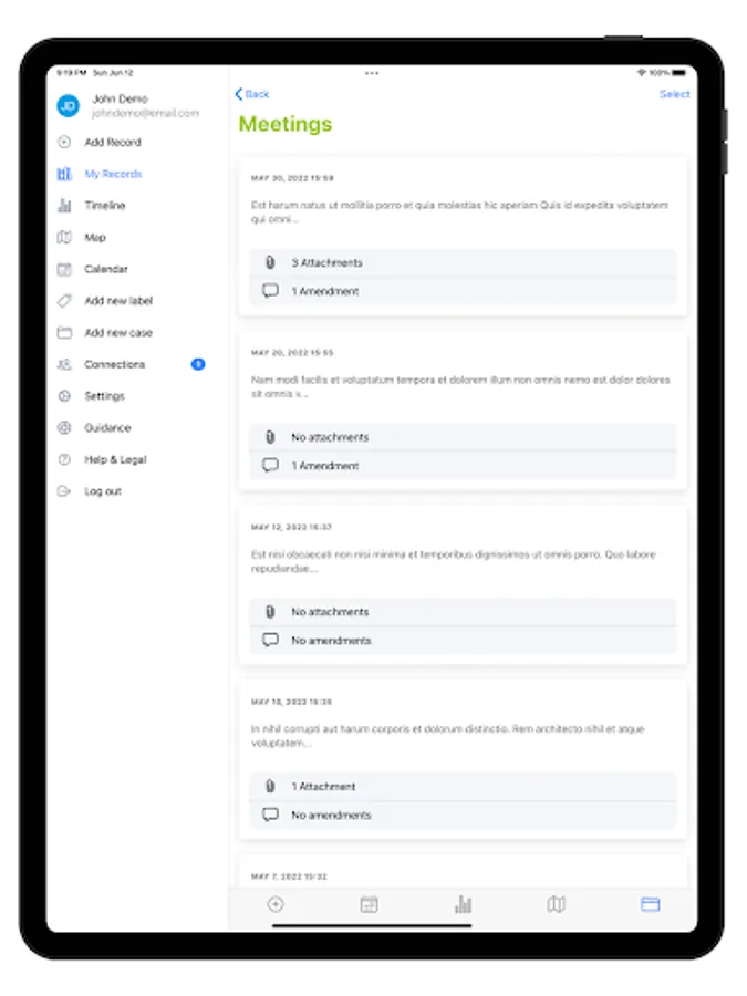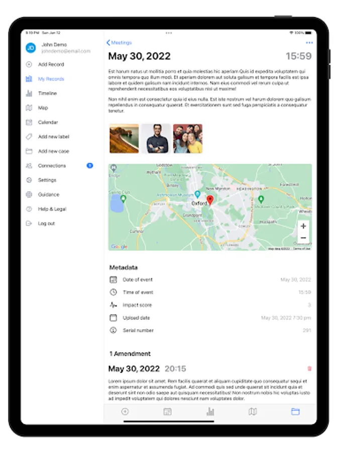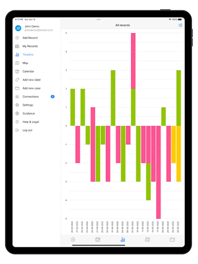 To prove that your records are true, you can show when and where your evidence was saved and rely on the integrity of uploaded photographs and other attachments to use them as evidence (only if photos are taken using the app can you prove you have not used editing software). Your records are automatically sorted into a date/time timeline and attachments are clearly linked to the record they relate to.