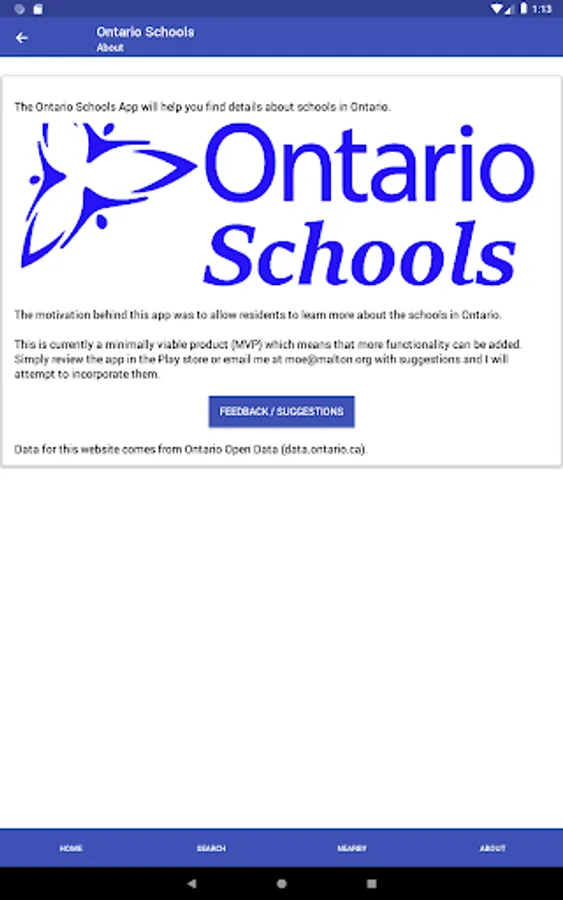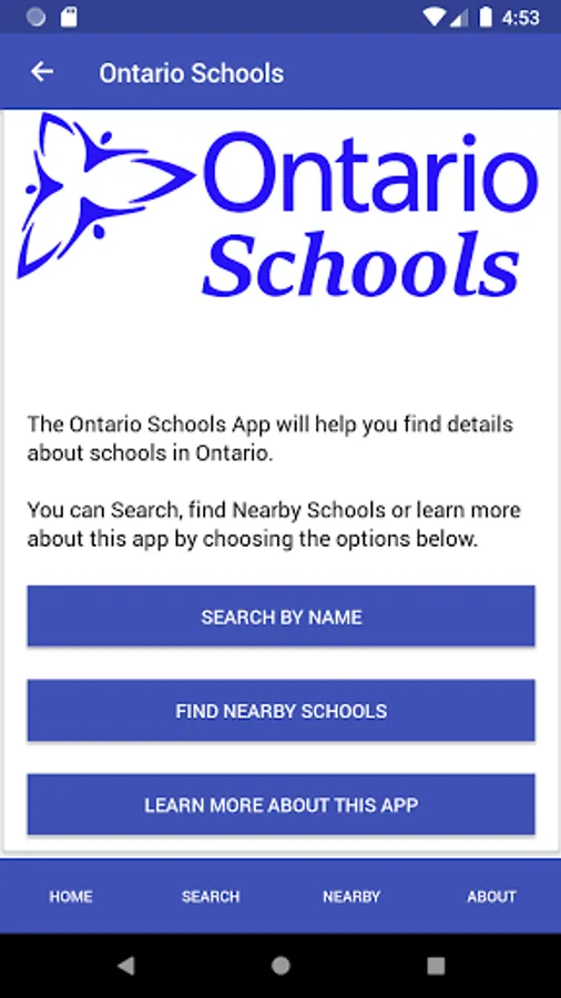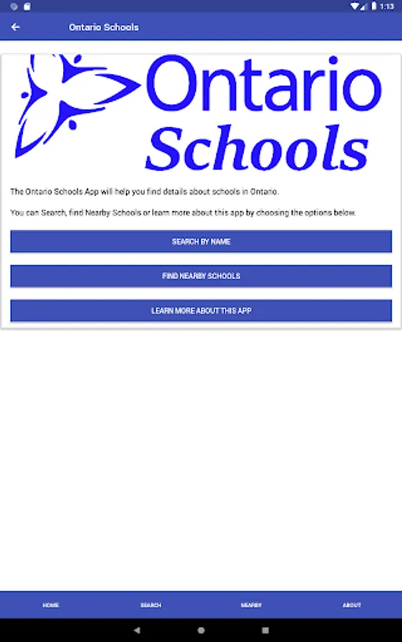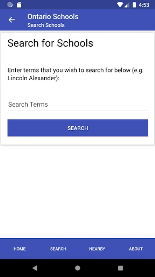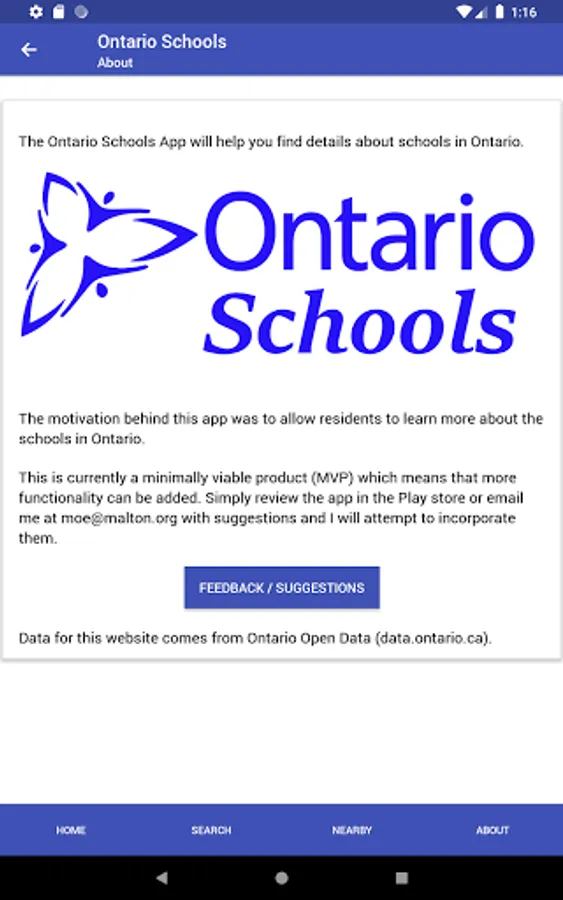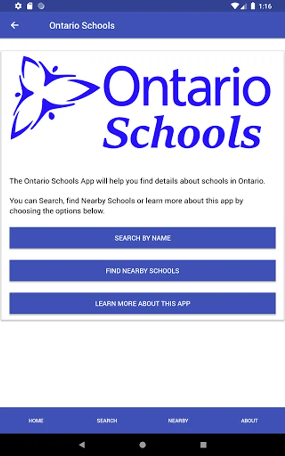 Allows you to search for schools in Ontario by name or find nearby schools. Open to feedback and suggestions on how to improve the app :)