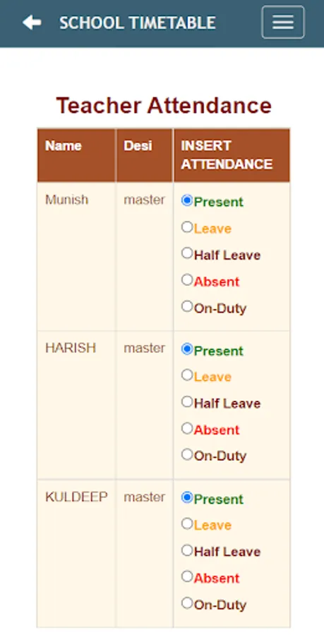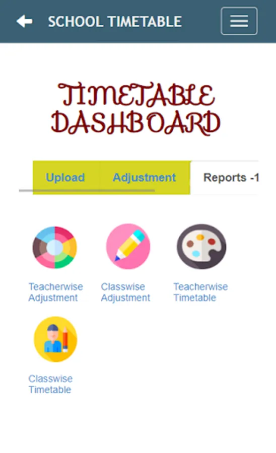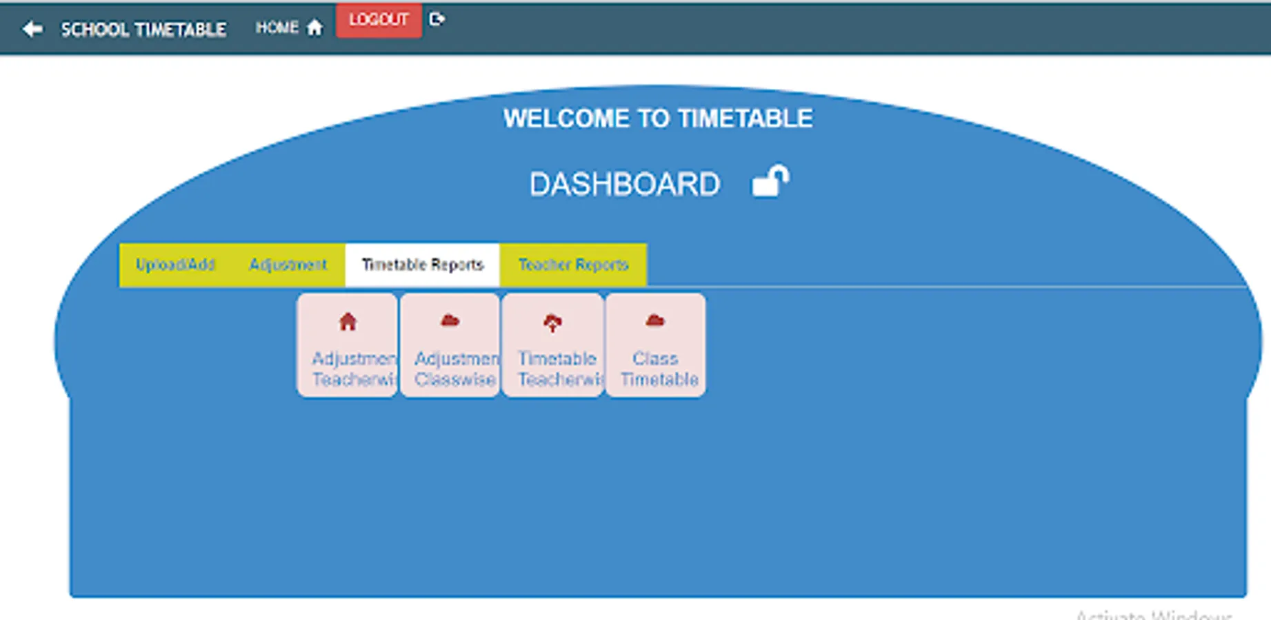 SCHOOL TIMETABLE app is manages the whole timetable process that is considered very difficult in schools.This app is mainly connected to the daily auto adjustment of teachers who are absent.This task is completed by 5 minutes that is half to one hour work to do it manually.All types of reports related to timetable are auto generated.