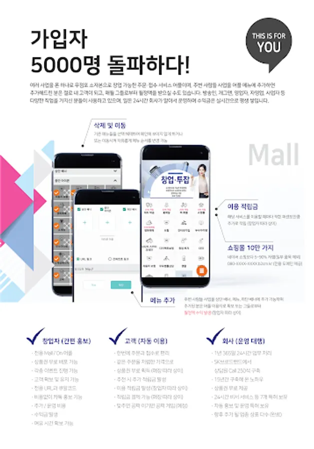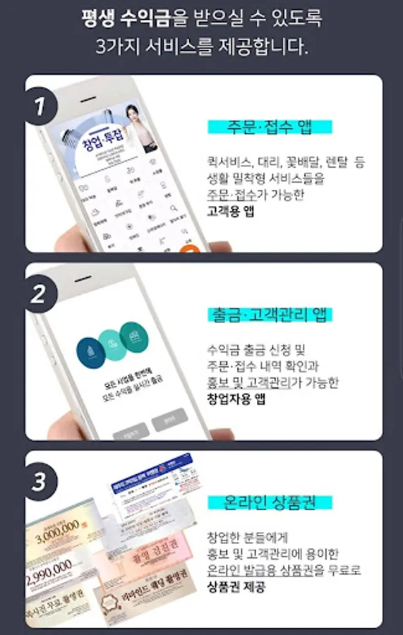 대리운전,퀵서비스,꽃배달,탁송,화물,이사,렌탈,중고차,신차,영화예매,렌트카등모든사업과 관련한 콜업무, 배달 수행, 민원, 정산은 모두 중소상공인지원단이 맡아서 하고, 창업자는 대표번호 홍보만 하시면 됩니다.