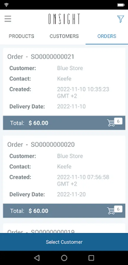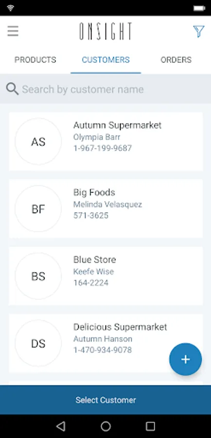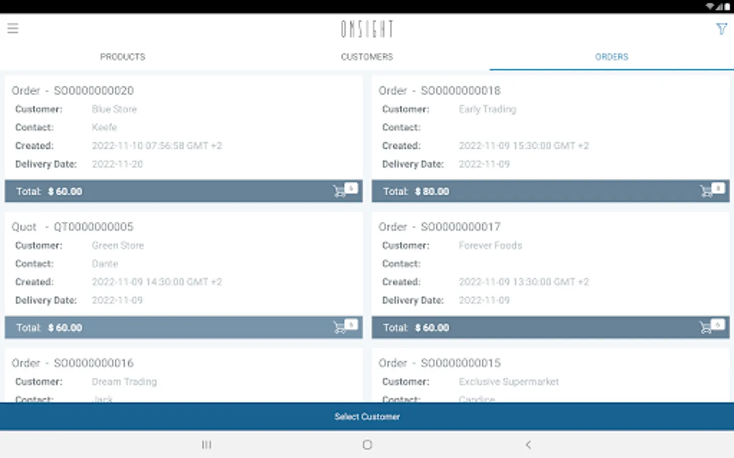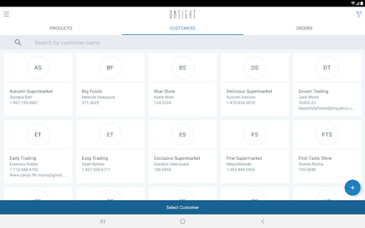Onsight is used by manufacturers, wholesalers and distributors with outside sales teams to make their outside sales reps more productive. Any changes made to customer contact details get synced and shared automatically. Product and pricing updates are pushed to the reps' mobile devices. Most importantly, sales orders are instantly sent to your office or warehouse for quick fulfillment.