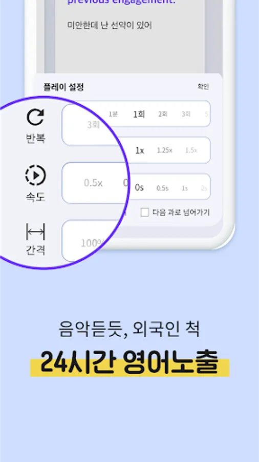 Adjust the speed, interval, and number of repetitions per sentence with OnStudy.