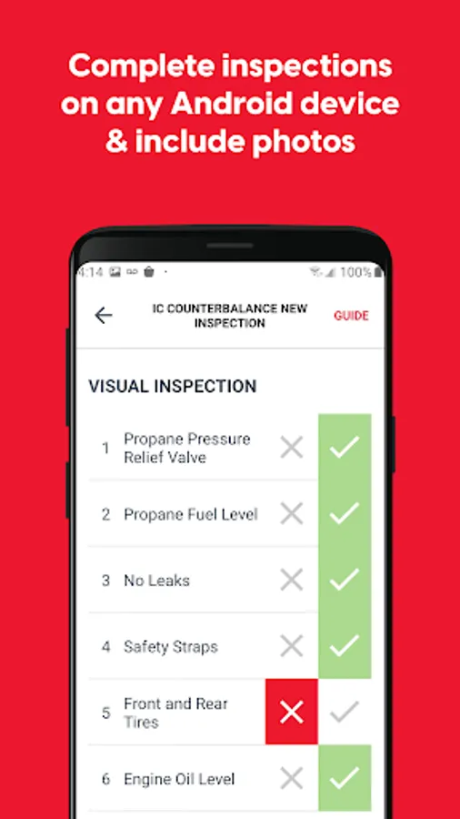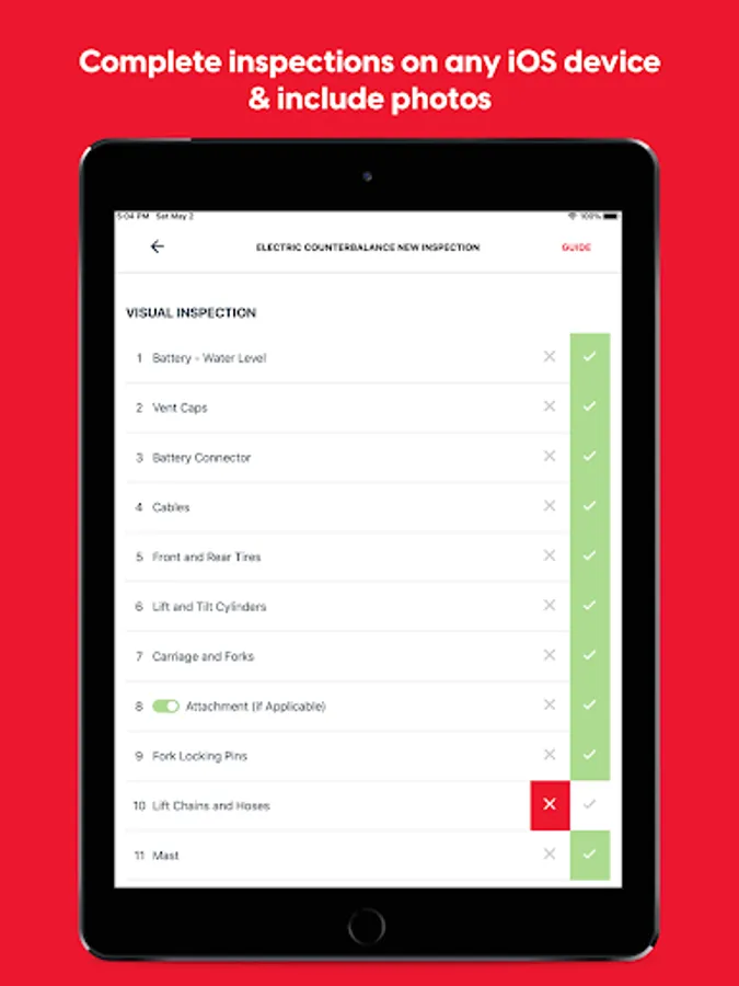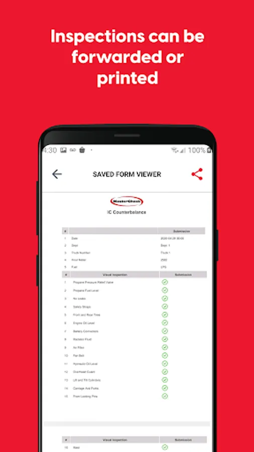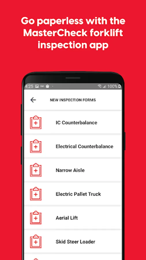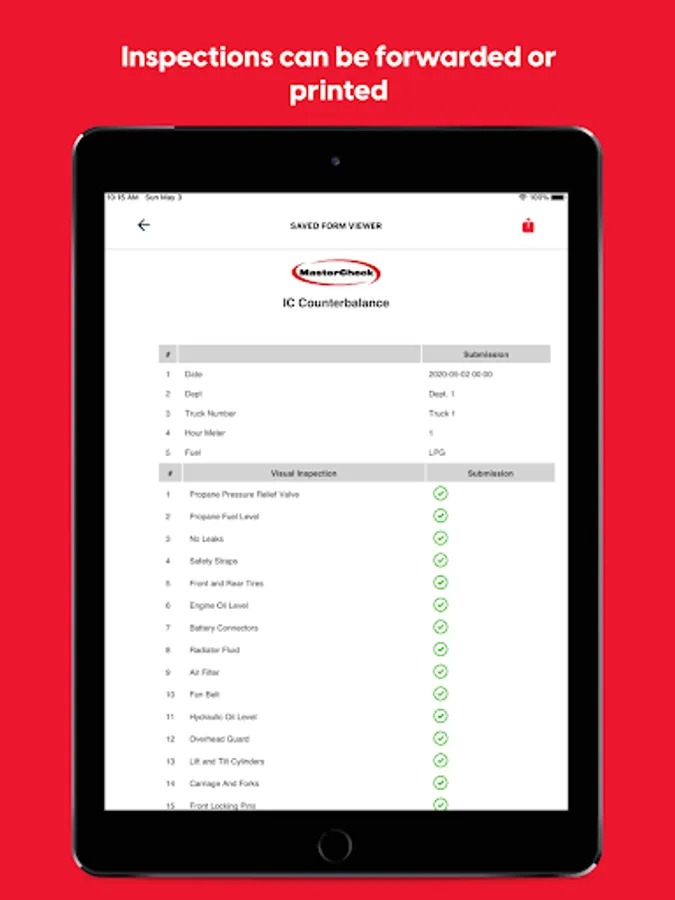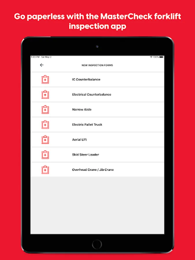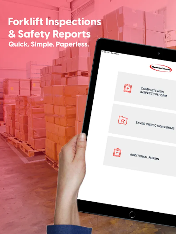 MasterCheck: Forklift Inspection App will easily enable your company to go paperless for forklift checklists and reports. Make sure that you comply with occupational health & workplace safety requirements and do your forklift circle check inspections on time.