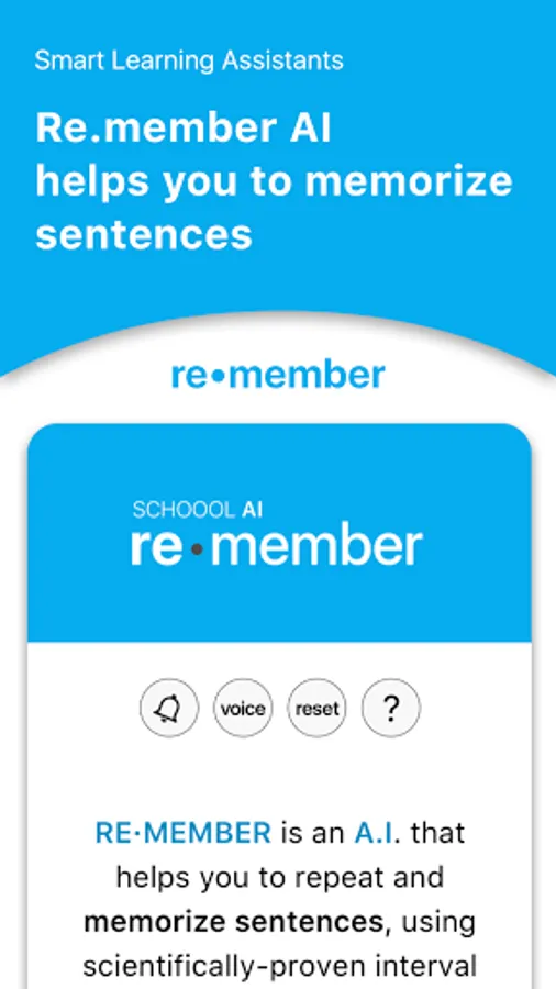 RE∙MEMBER is an A.I. that helps you to repeat and memorize sentences. It trains your brain not to forget learned sentences, using scientifically-proven interval and repetition patterns.