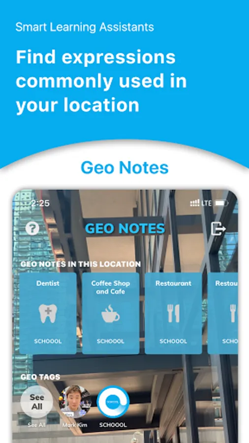Geo Notes is the location-based virtual study notes. We located them around the globe. Each Geo Notes contains useful English & Korean expressions frequently used in its location. The expressions vary based on the location types such as hospitals and shopping malls. You can find the virtual Notes using this app. You can also create your own Geo Notes and locate them anywhere.