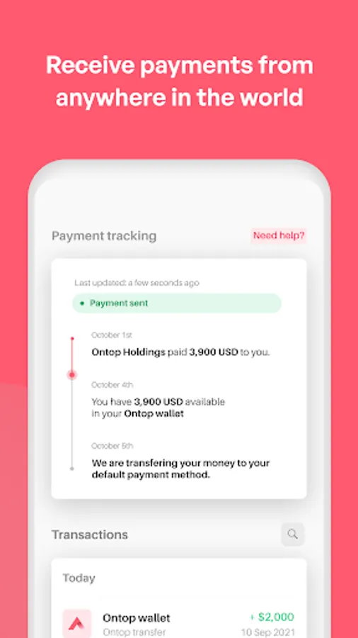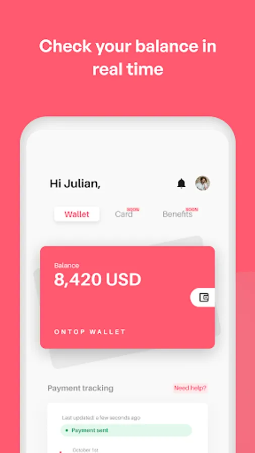 Get full control of your paychecks with a few taps. Ontop allows you to receive your paycheck no matter where you are in the world, send it to multiple accounts or simply spend it with our Card.