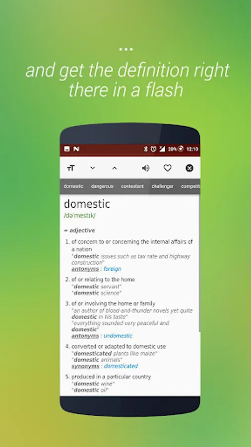 Definitions are based on English Wiktionary hence they are comprehensive and easy to understand. With Wiktionary, you get the best definition, synonyms, antonyms and example sentences.