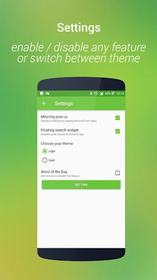 Auto-Start: Dictionary gets started automatically during the booting up of the device, and works from the background. This feature can also be turned on/off from the settings of the main application.