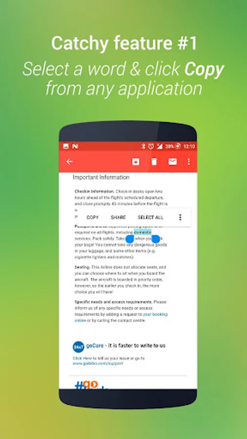 Meet, onTouch English dictionary, shows the definition/meaning of English words as pop up without opening dictionary app ever. No hassle of switching between apps. Save time, improve productivity. You can also use this as normal English Dictionary.