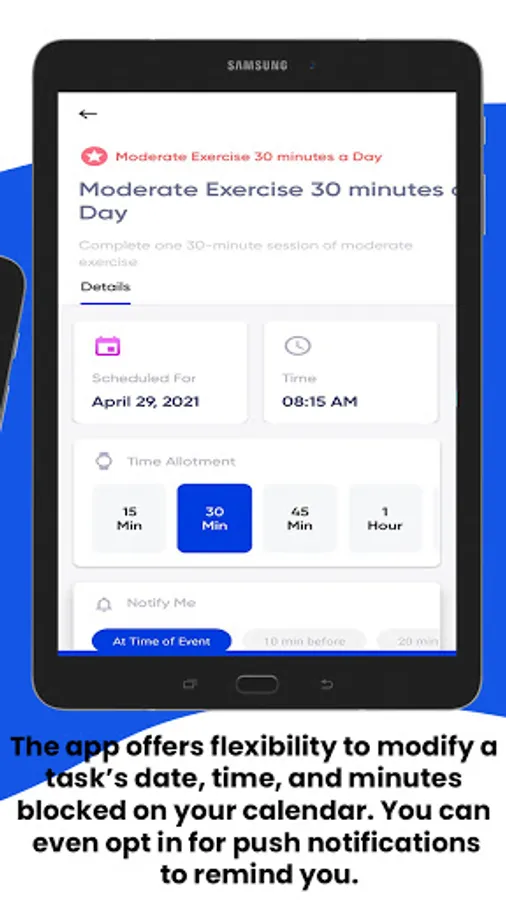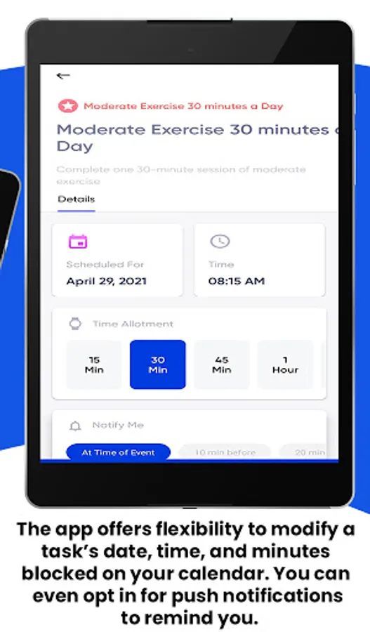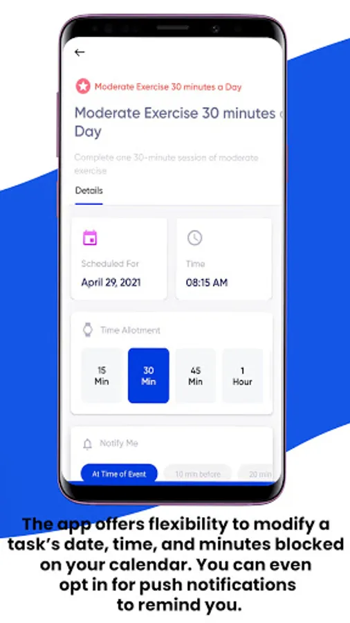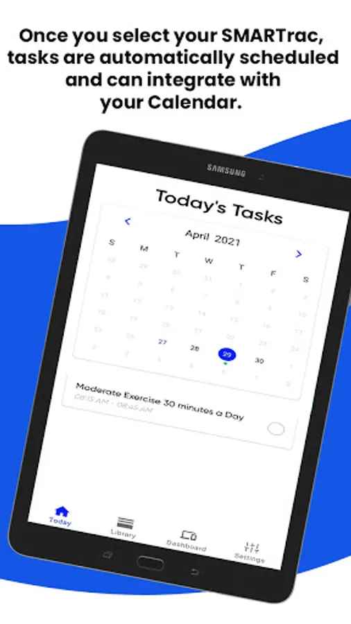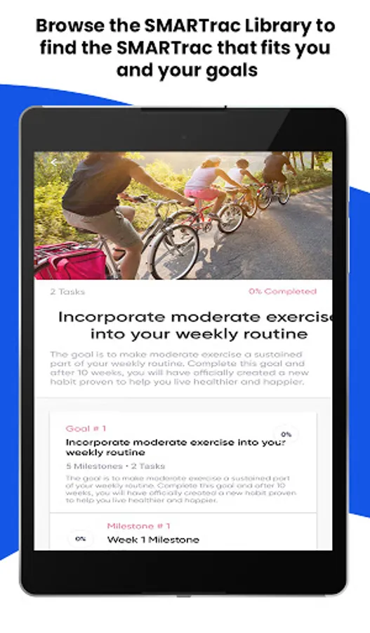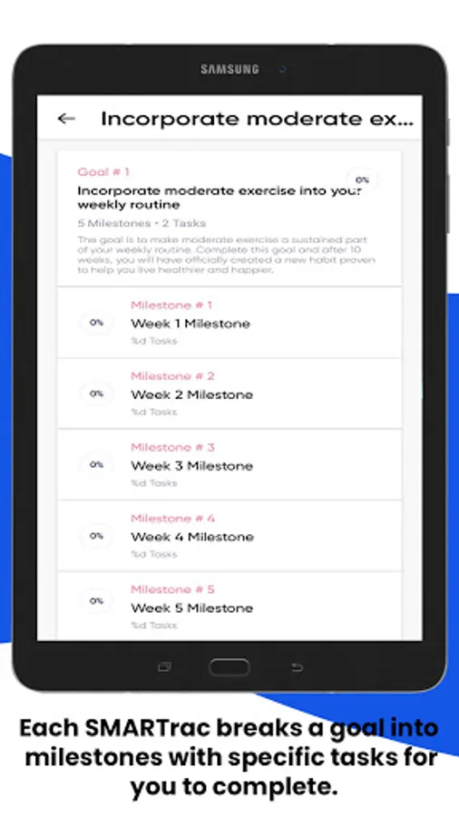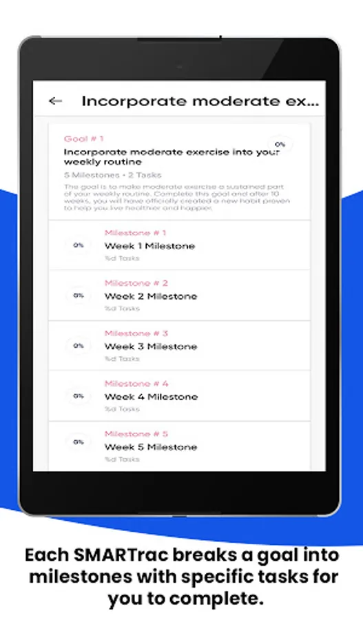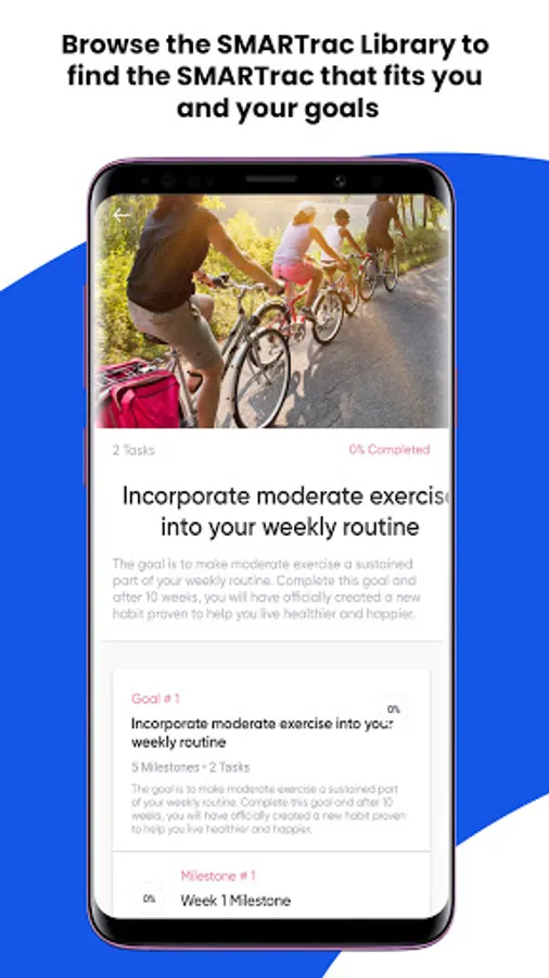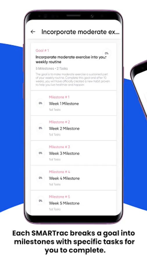 Each SMARTrac breaks down a goal into milestones to set up “small wins” and keep you motivated. The tasks required to achieve each milestone appear daily in the mobile app and can be scheduled automatically on your smartphone calendar. You can even opt in for push notifications to proactively remind you of upcoming tasks.