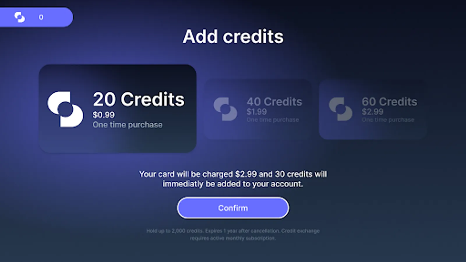 • Unused credits will continue to roll over to next month with an active subscription. Hold up to 2000 credits at a time that expire 1 year after cancellation.