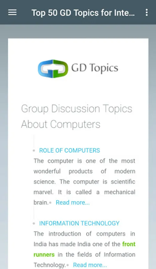 There are various gd topics with exact explanation and user answers. The topics are about computers, environments, educations and so on.